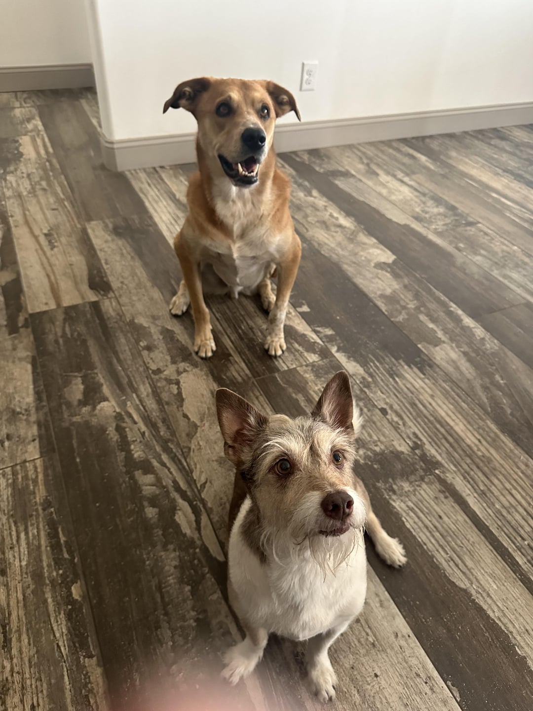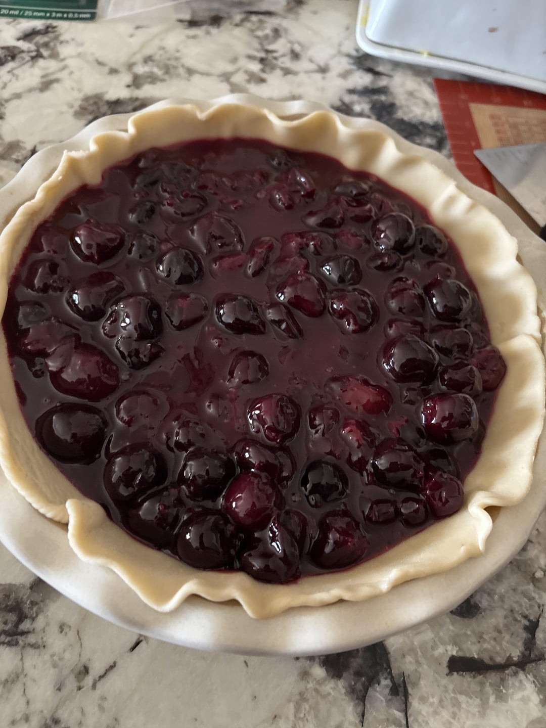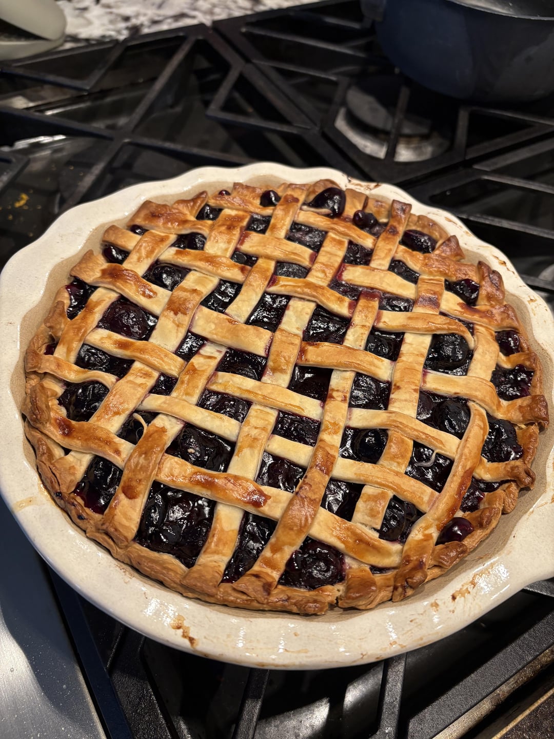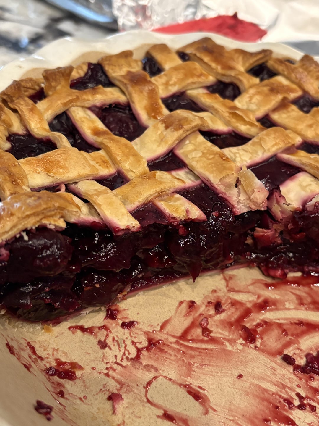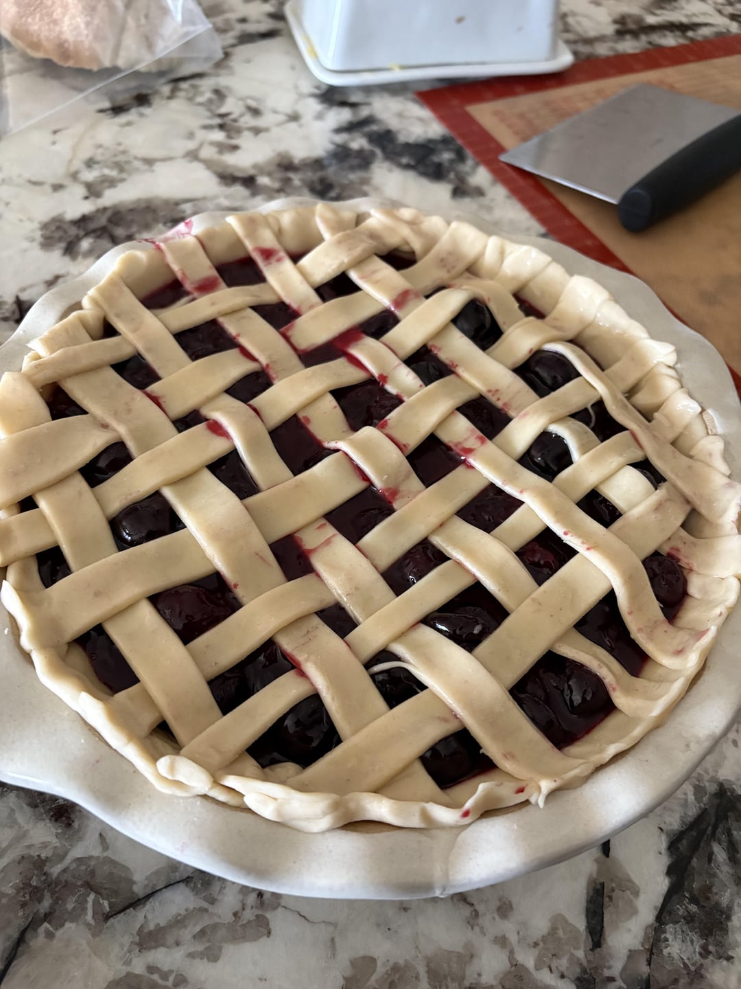 My lattice is a little wonky but the filling didn’t run after it cooled!! Never had a cherry pie that didn’t run all over the pan. + Bonus pups 🤗