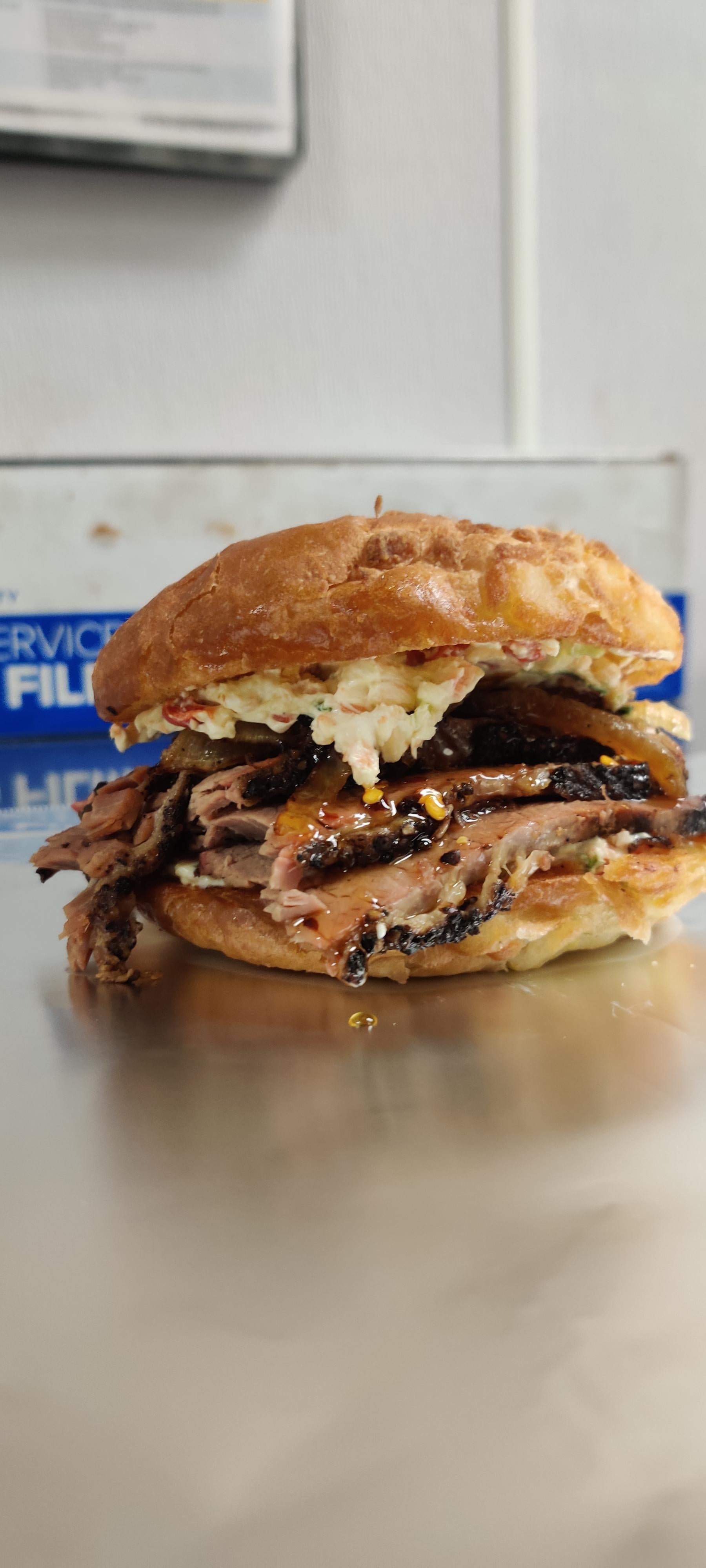 Pegress 12 months ago Dutch Crunch roll griddle toasted in beef tallowLoaded garden pimento cheeseSmoked brisketDeep fried onionHot honey drizzle
