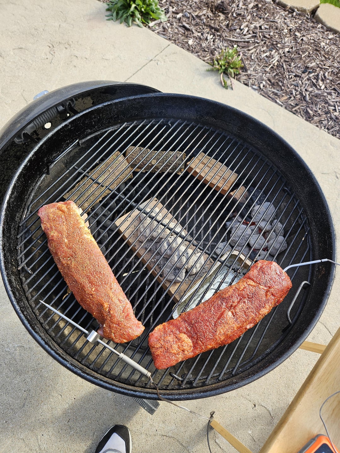 Way too many wood chunks and 4 or 5 will do nothing as the ribs will stop taking smoke before they are lit.