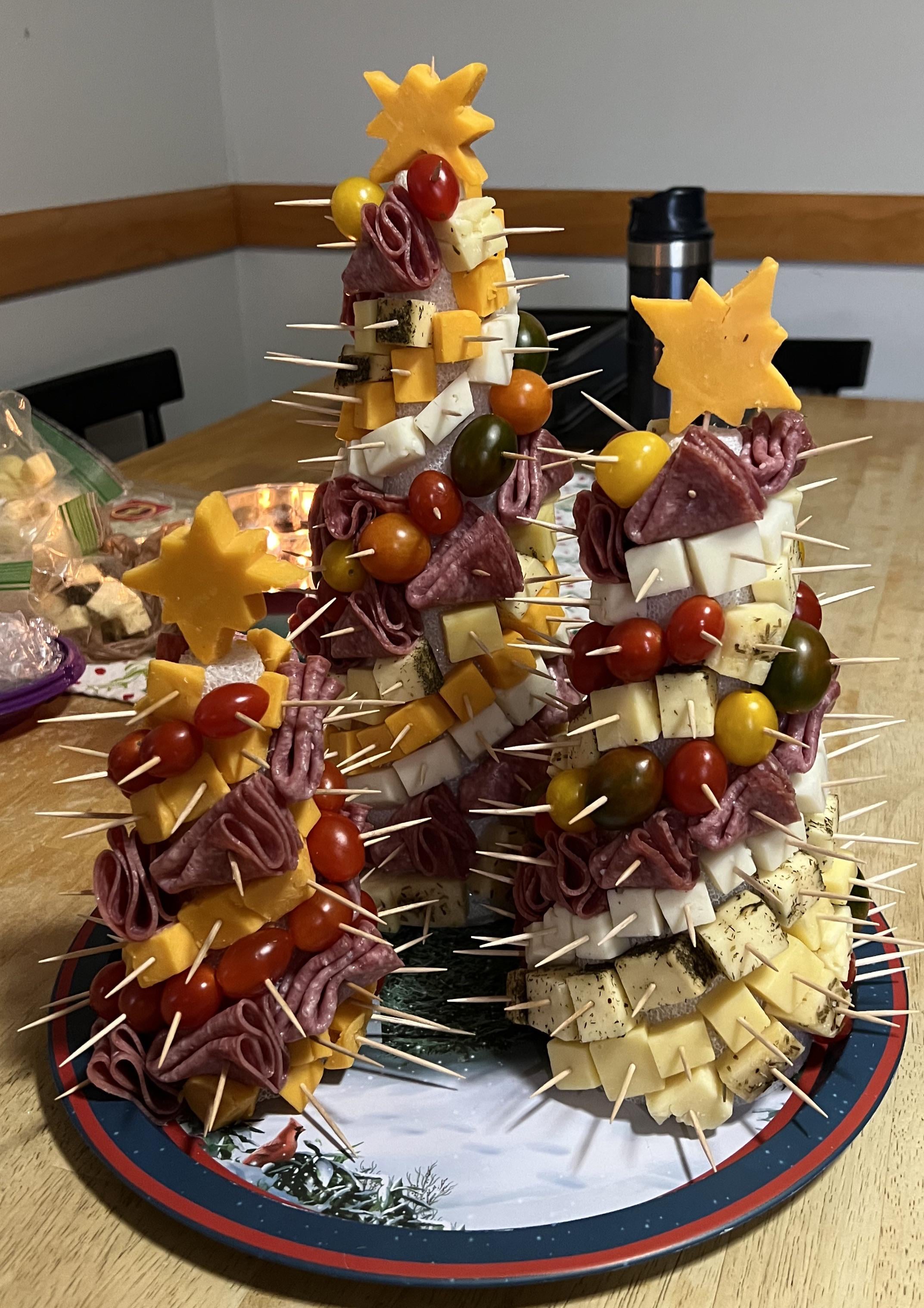 I can feel the toothpick jab under my fingernail as I grab for a slice of salami. It’s a no for me, dawg. I’m too uncoordinated for this tasty tree!! Looks like a lot of work went into it.