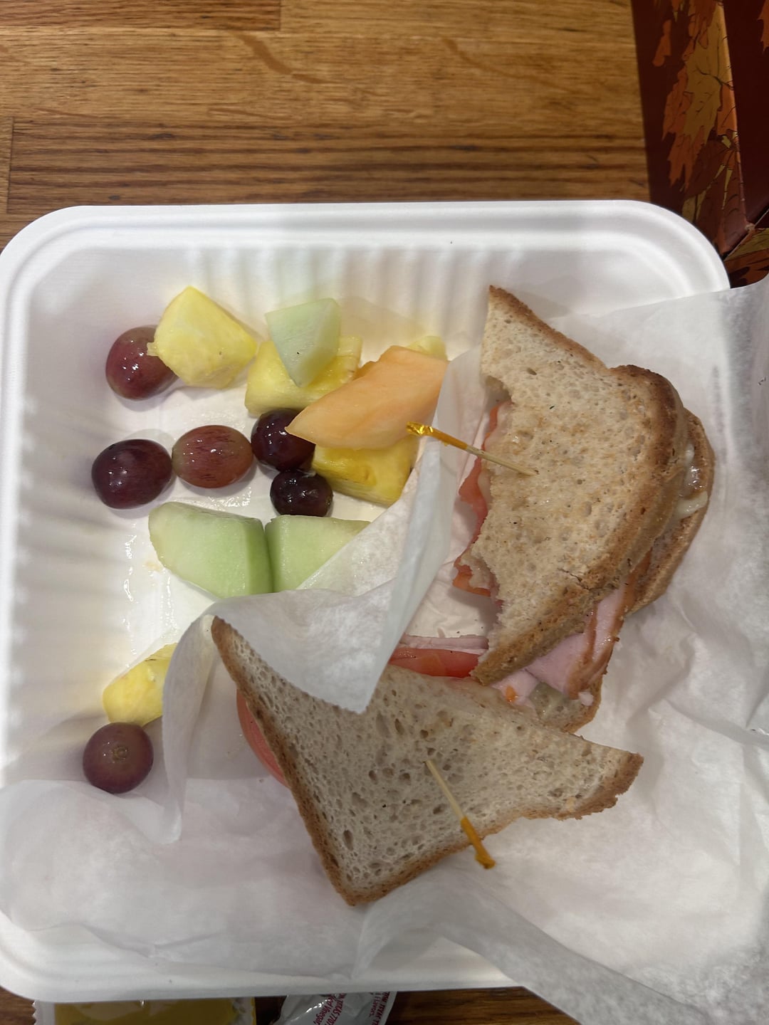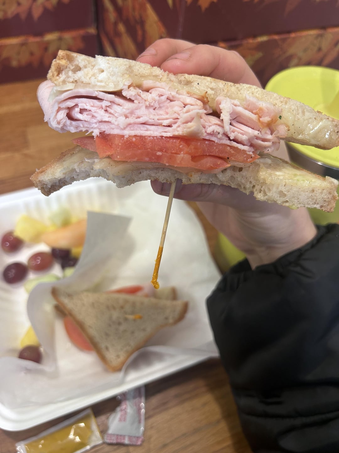 HumbleShrink 1 year ago Well, 2 slices of bread 160-180, Dno about turkey 😂, 80-100, Mayo 40, Cheese 60, Fruits 60-70.So we looking at 400-450 I think.