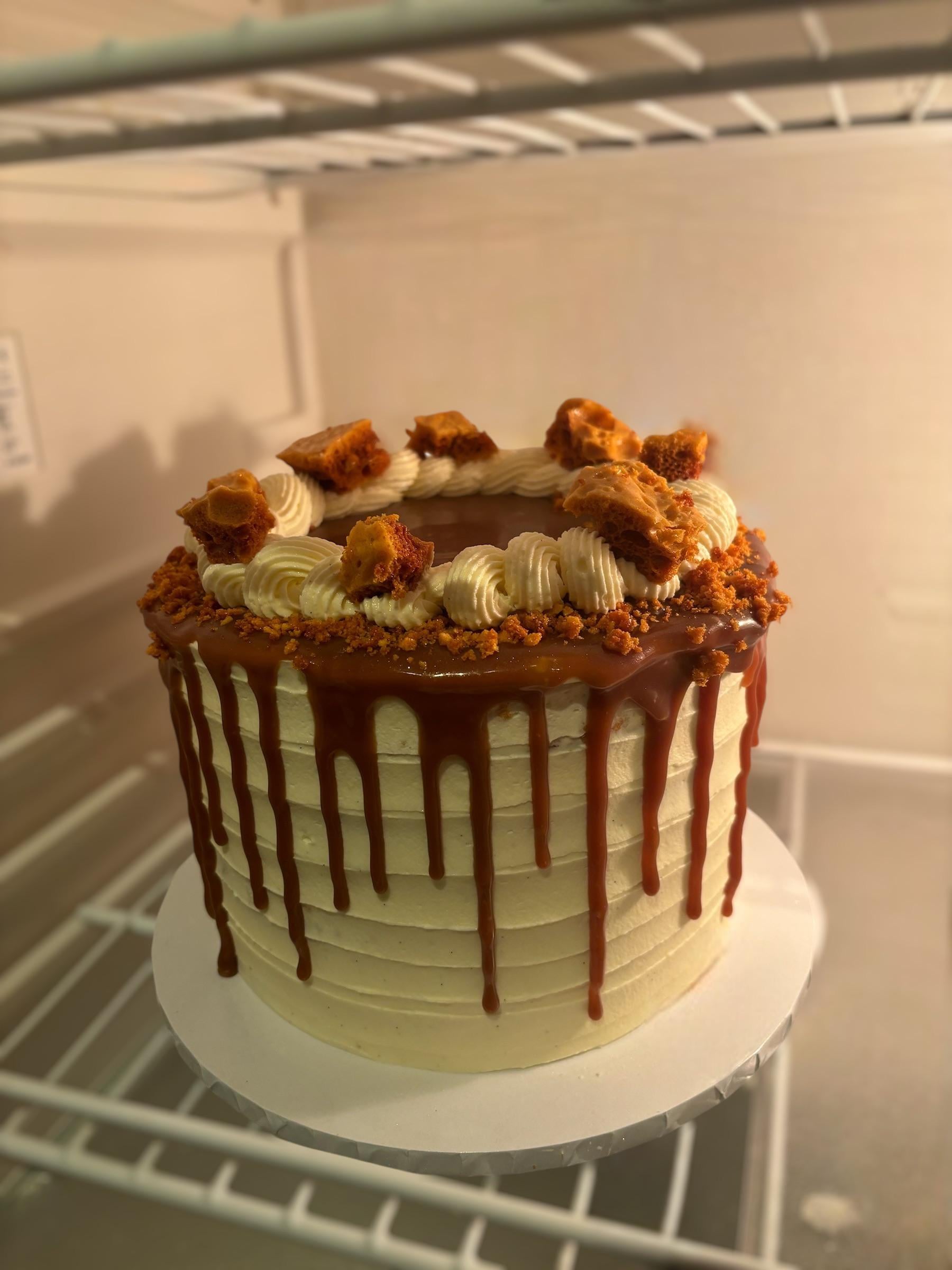 Birthday cake for my customer’s sister. Vanilla sponge with vanilla buttercream, homemade caramel and homemade crushed honeycomb inbetween each layer with caramel drip and big honeycombs on top! 🌟by timeforacatnap 2 Comments NewbieMaleStr8isBack 11 months ago Looks good and delicious Felicity110 11 months ago Looks delicious. Honeycomb as in the cerealWrite A CommentYou must be logged in to post a comment.