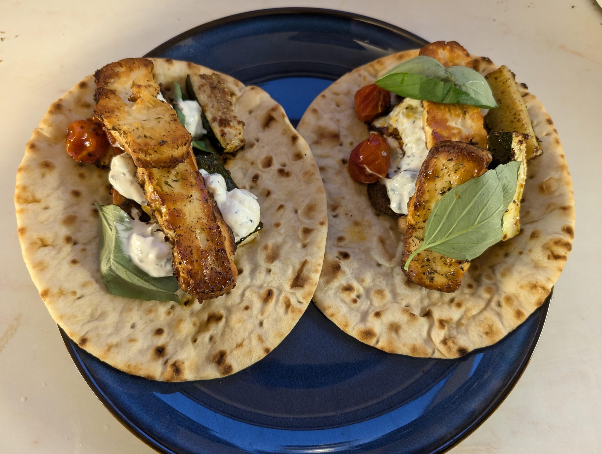 Served with tzatziki, roasted courgette & tomatoes.