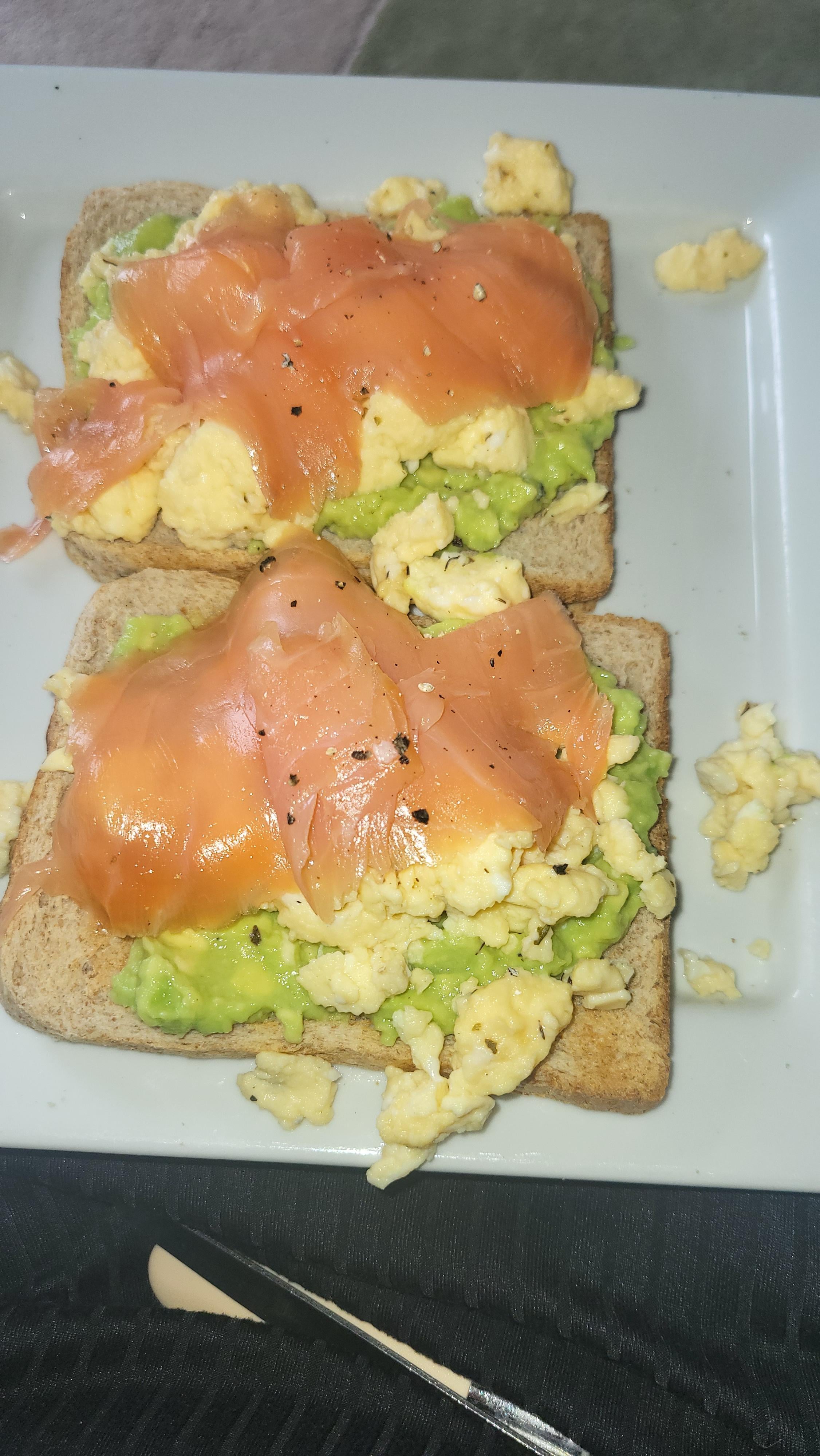 Quick brunch .. toast eggs salmon and scrambled egg.