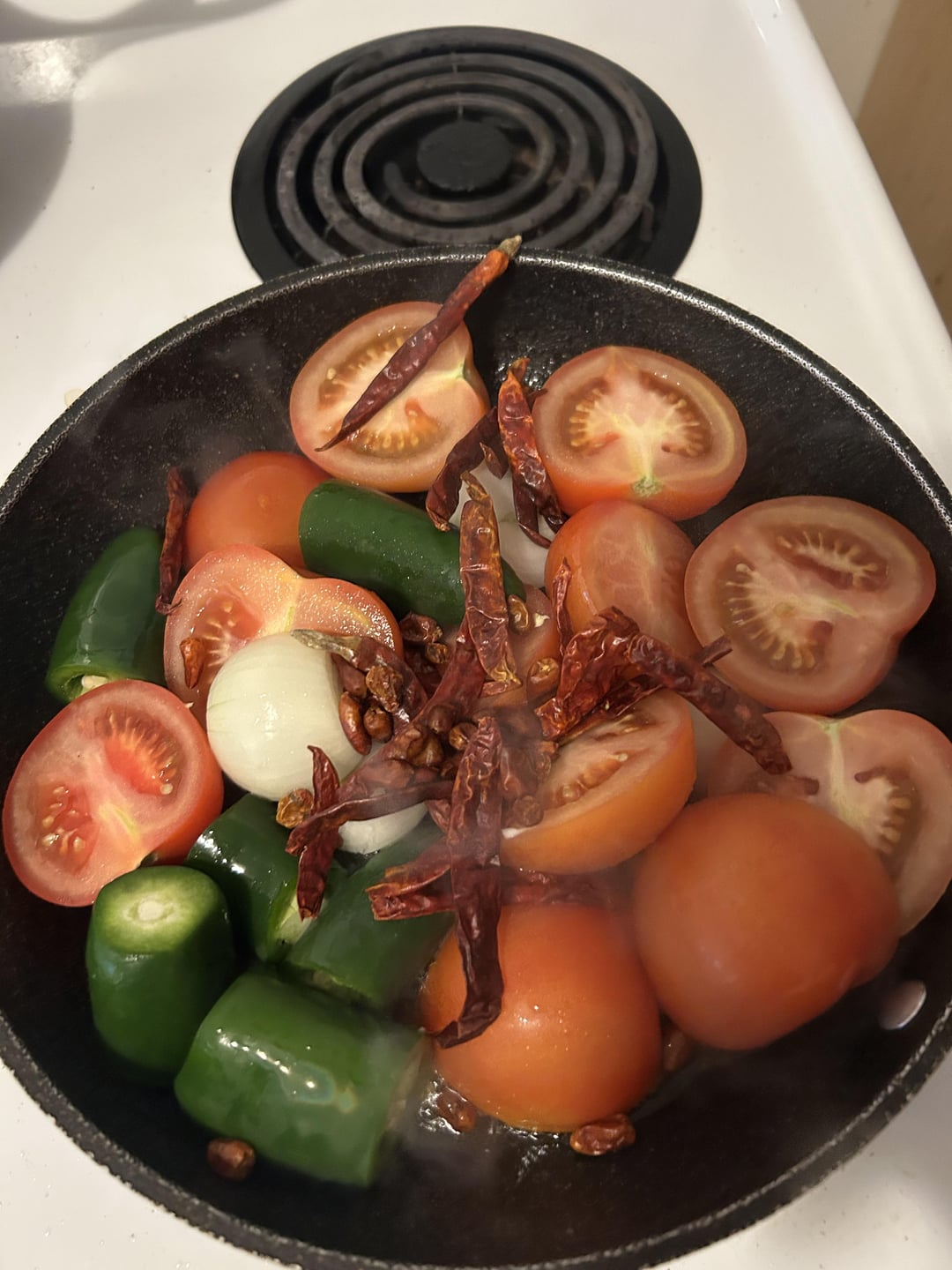 I fried everything in some vegetable oil. I added some chicken bouillon and water once the veggies had some nice colour and were very fragrant.