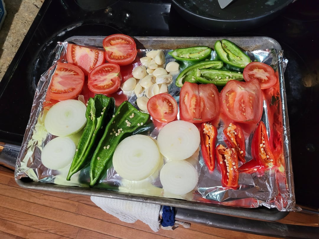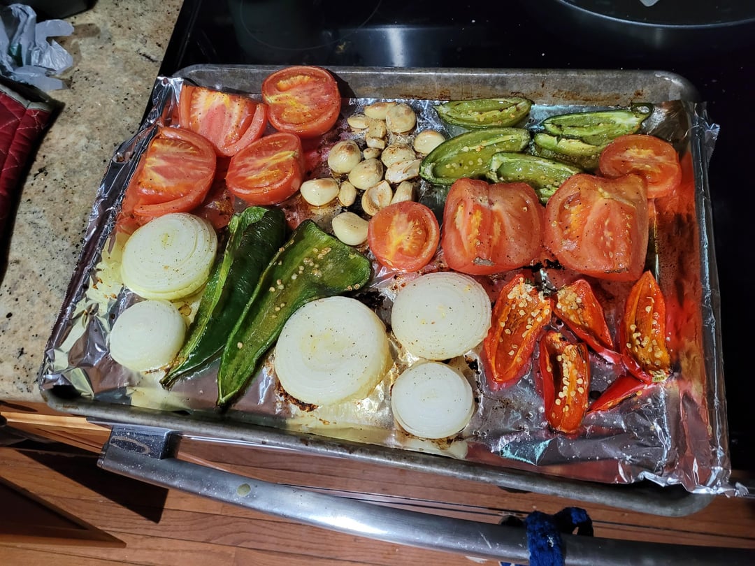 Added in 4 tomatoes, 1.5 onions, 1 poblano, 2 jalapeños, bulb of garlic, 2 fresnos, 1/2 cup water, peppers lightly deseeded, all lightly roasted 450 for 15 mins, with olive oil and salt/pepper. Added in juice from 3 limes to the blender. Ended up pretty decent overall, 8/10, would do again.