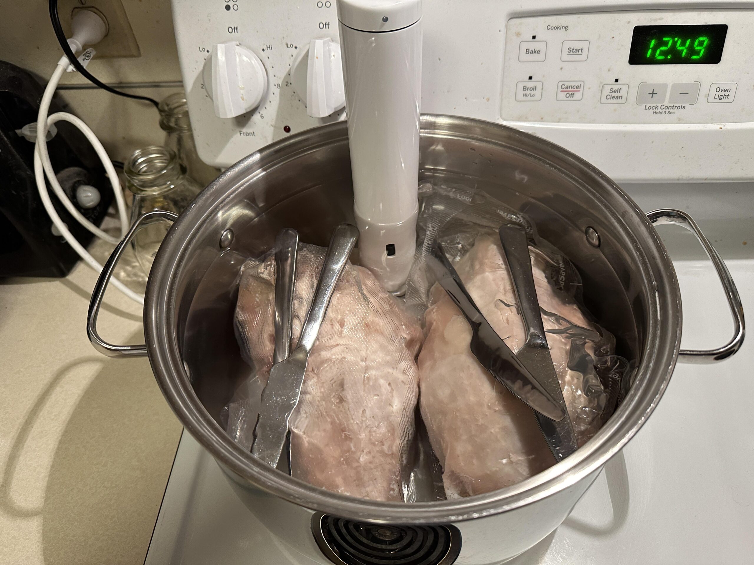 Safeway had a whole boneless breast yesterday… and since it's destined for Freezer Camp, went ahead and cooked it (3.5 hours at 155) today to get it off my to-do list.