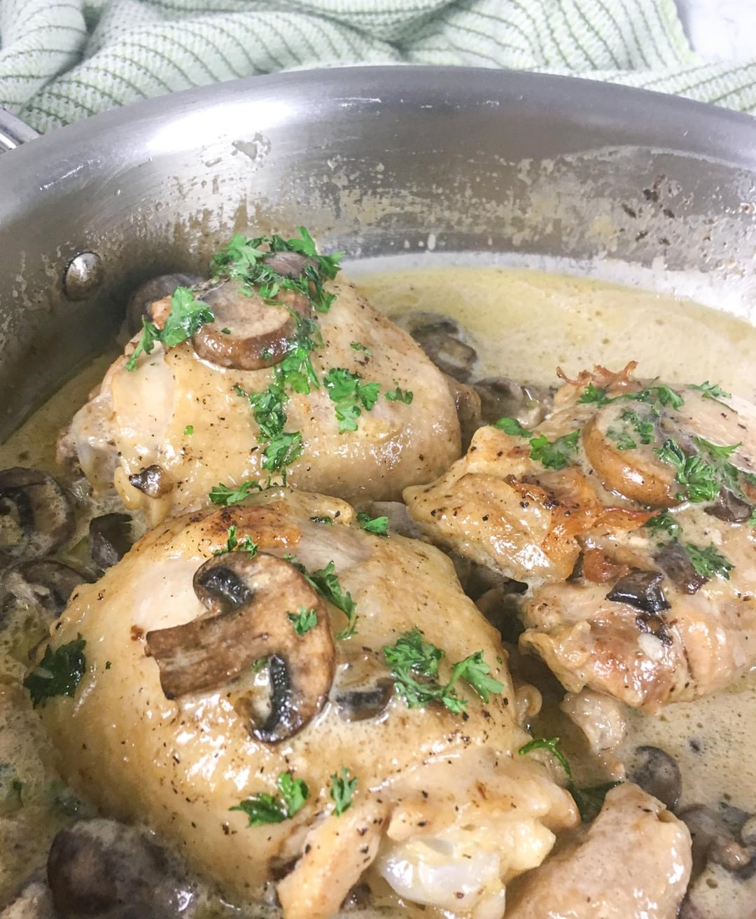To serve, spoon some of the pan sauce and mushrooms over each chicken thigh and sprinkle with some fresh parsley, if desired. Serve immediately with your choice of sides. Enjoy!