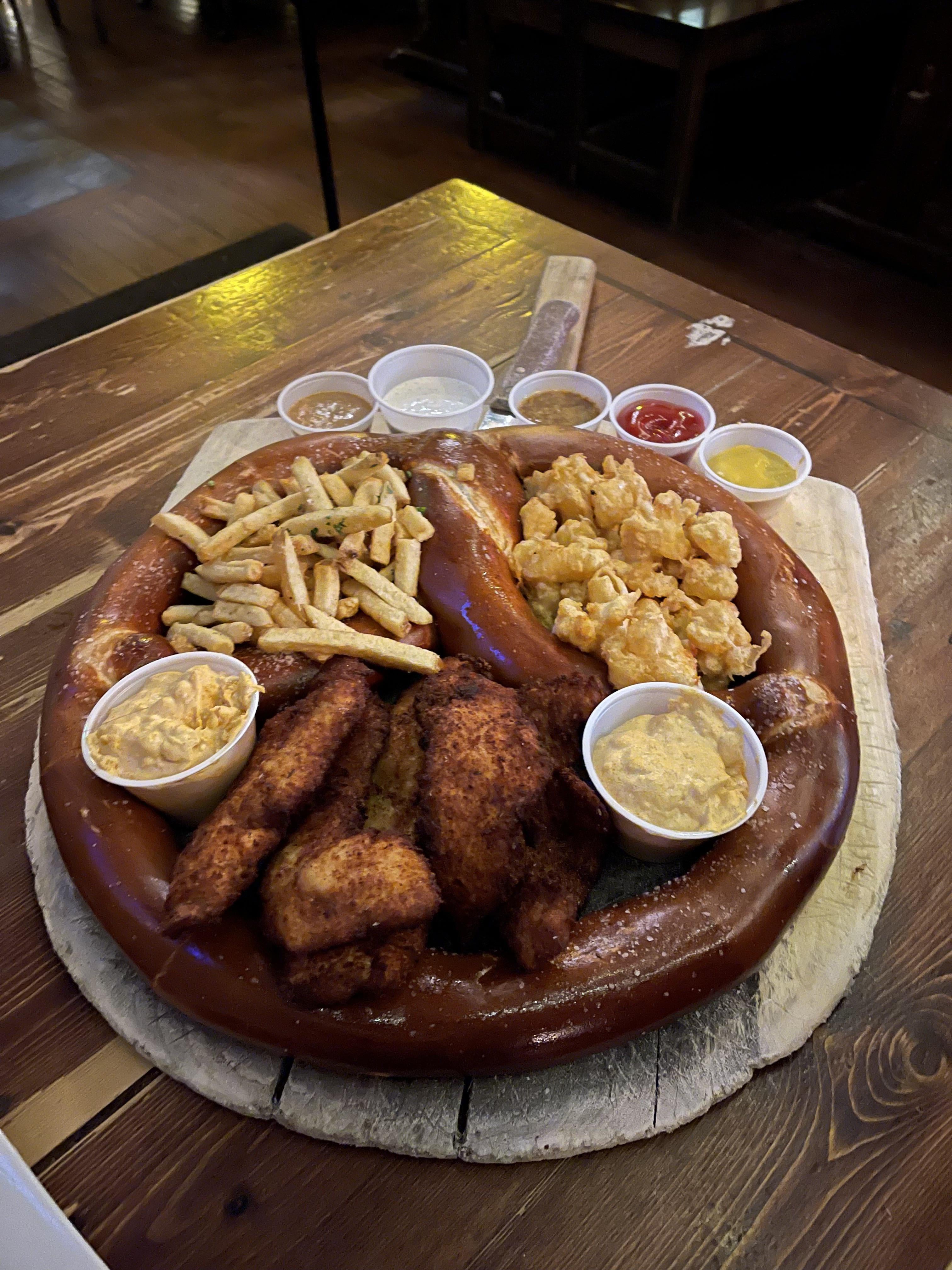 For those who are asking what this absolute unit contains: it’s fries, chicken schnitzel strips, and cheese curds encased in a giant doughy pretzel. Complimented with two big cups of delicious beer cheese, Dijon mustard, ranch, ketchup, mustard, and some other sweet Dijon-esque dip.