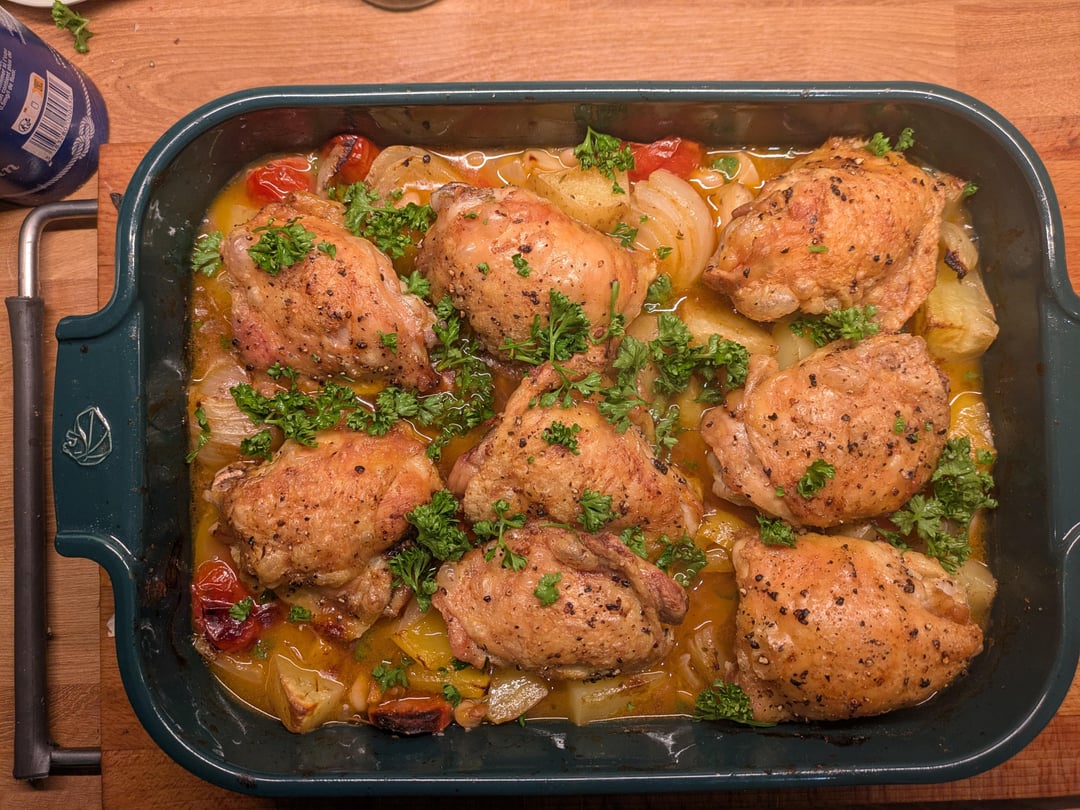 Had loads of chicken thighs, so browned them off before putting in the oven with white beans, chorizo, onions, garlic, cherry toms, potatoes, peppers and lots of paprika.