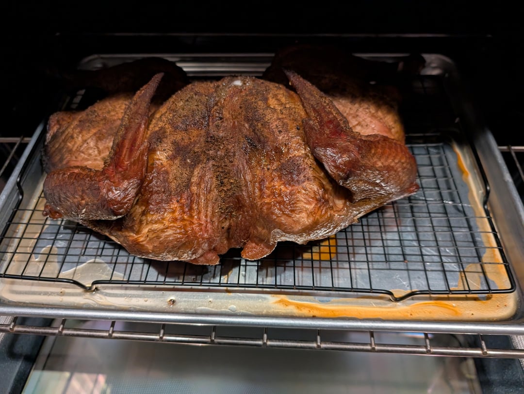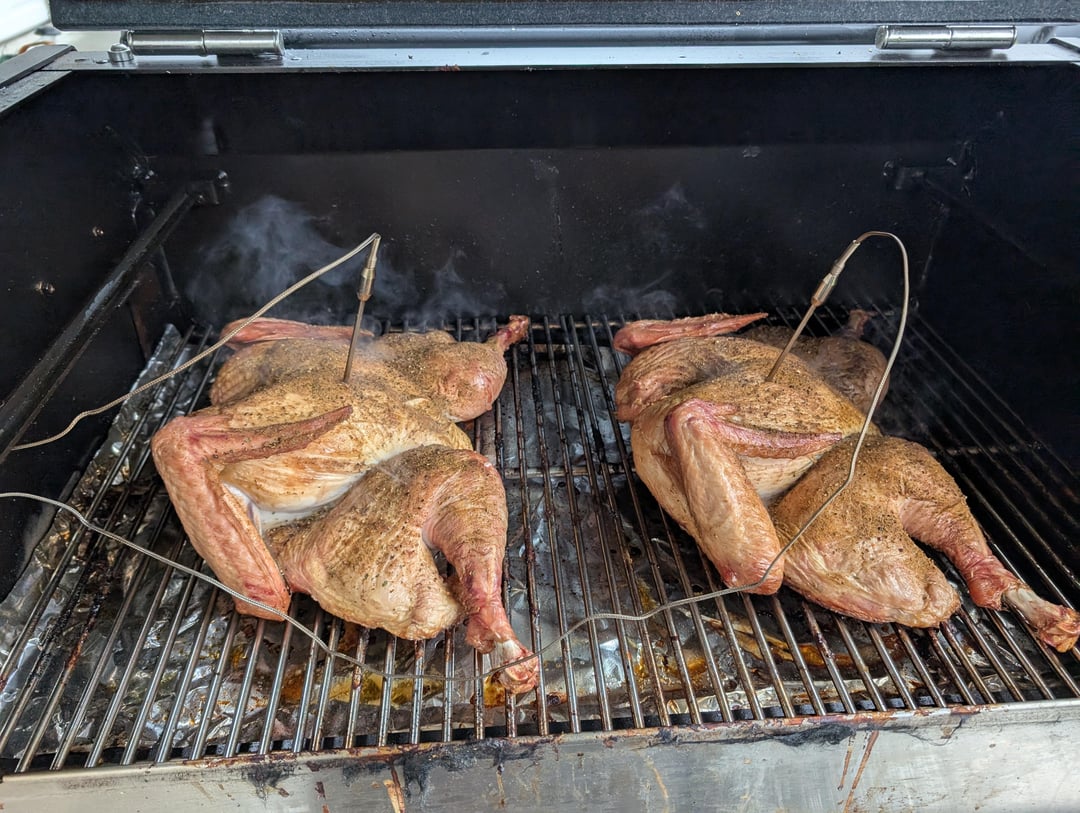 Decided to give spatchcocking a try. Injected with chicken broth and lemon juice. Seasoned with Dan-O spicy and ground peppercorn. Smoked at 300 to 155 on the breasts.