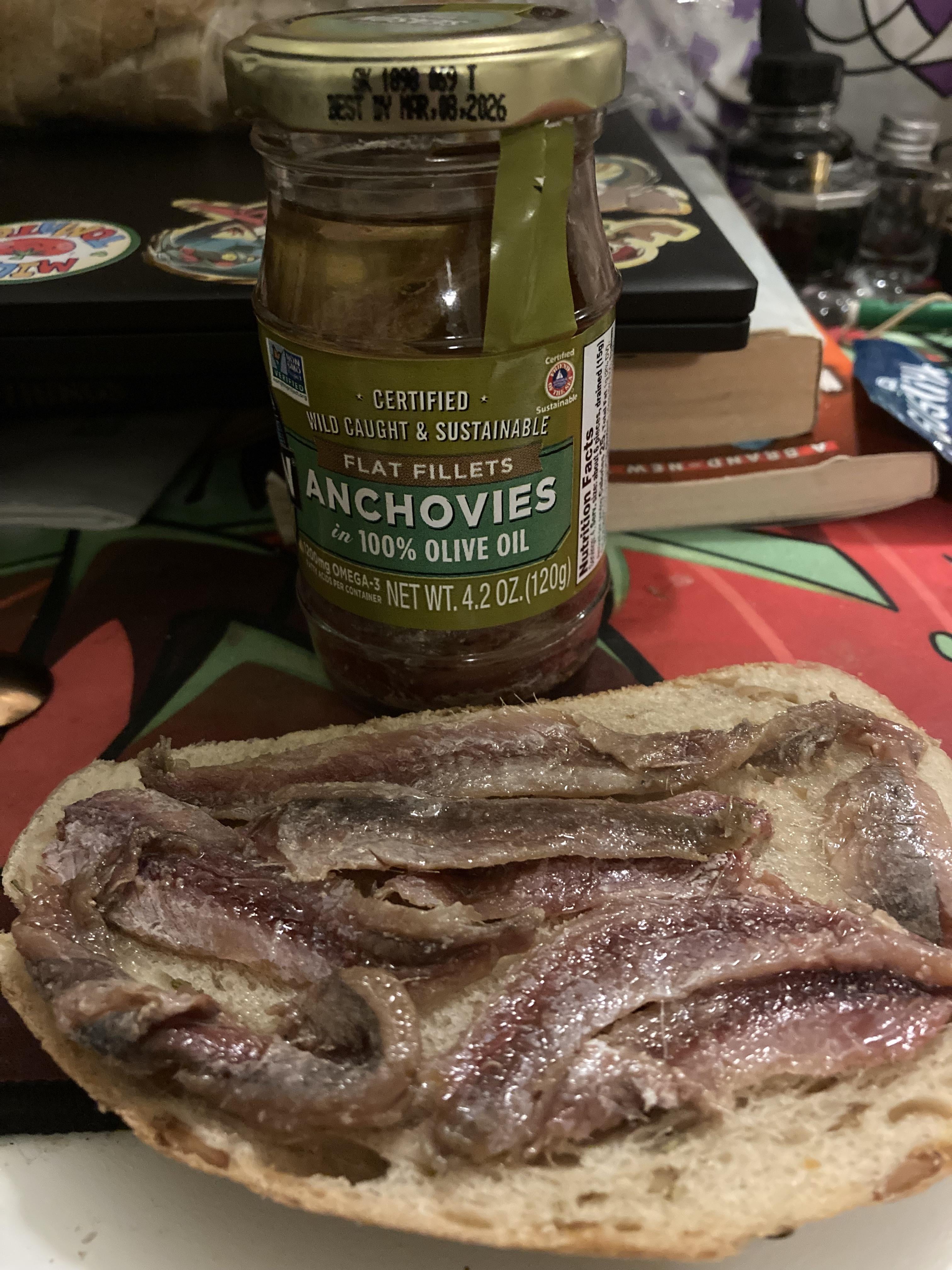 I’m normally an absolute fiend for salt and can hardly get enough of it. I’ve finally met my match! When I took my first bite I nearly spat it out because of how salty it was! Had to end up just popping an individual anchovy in my mouth each time I took a nice big bite of bread so I didn’t overwhelm myself with the saltiness, and even then it was a little much. All in all the flavor was wonderful, fishy in a good way, plenty of umami, the texture of the bones wasn’t noticeable, and it was overall an enjoyable experience. I will be slowly finishing this jar with some sourdough bread.