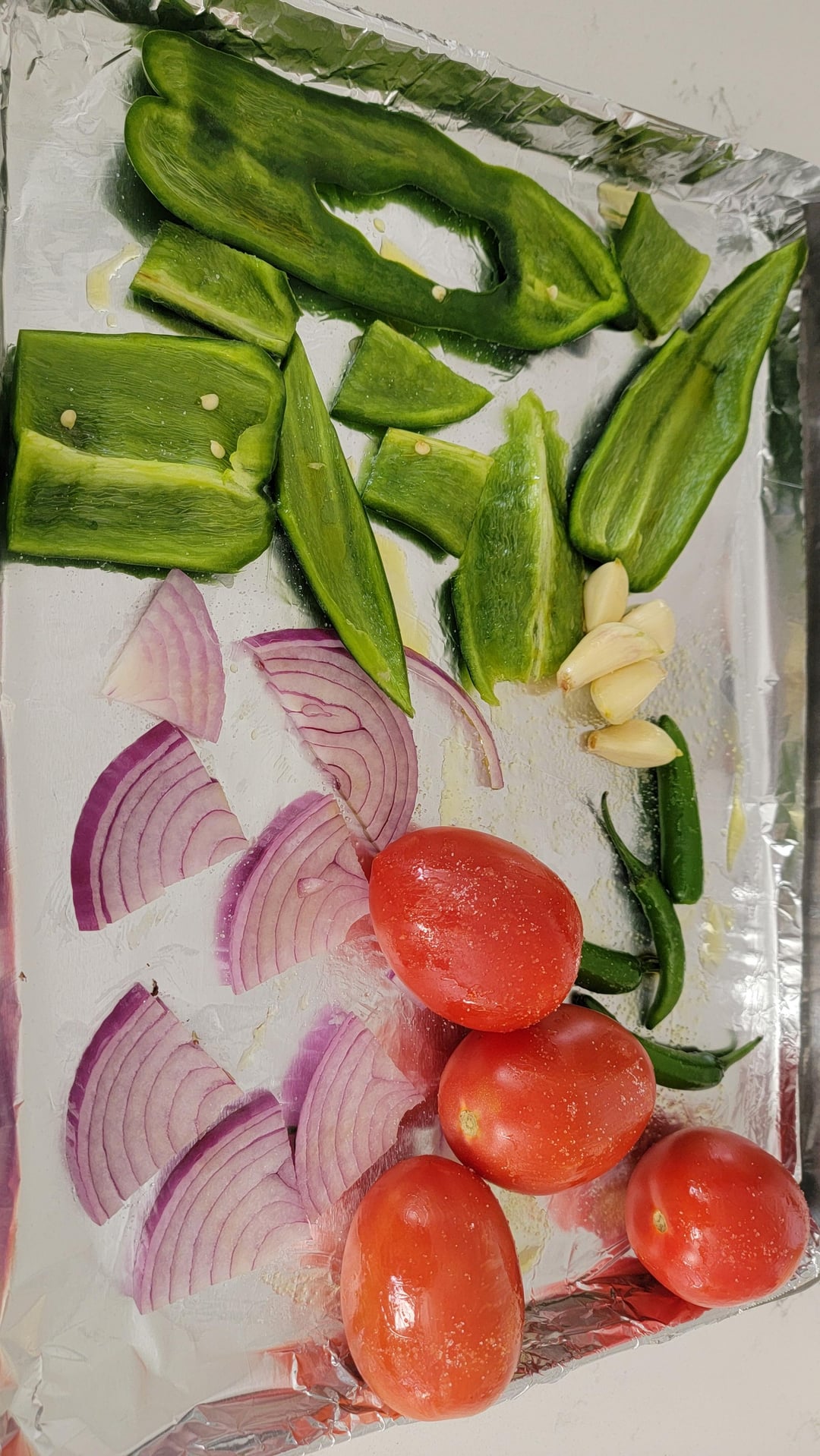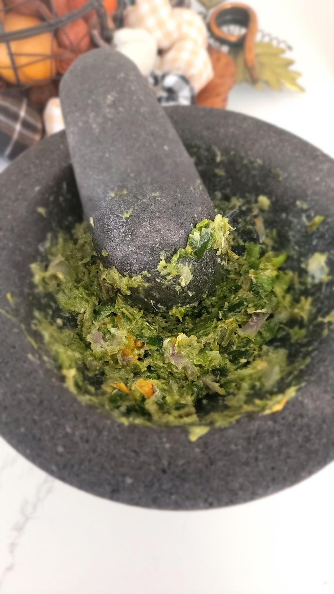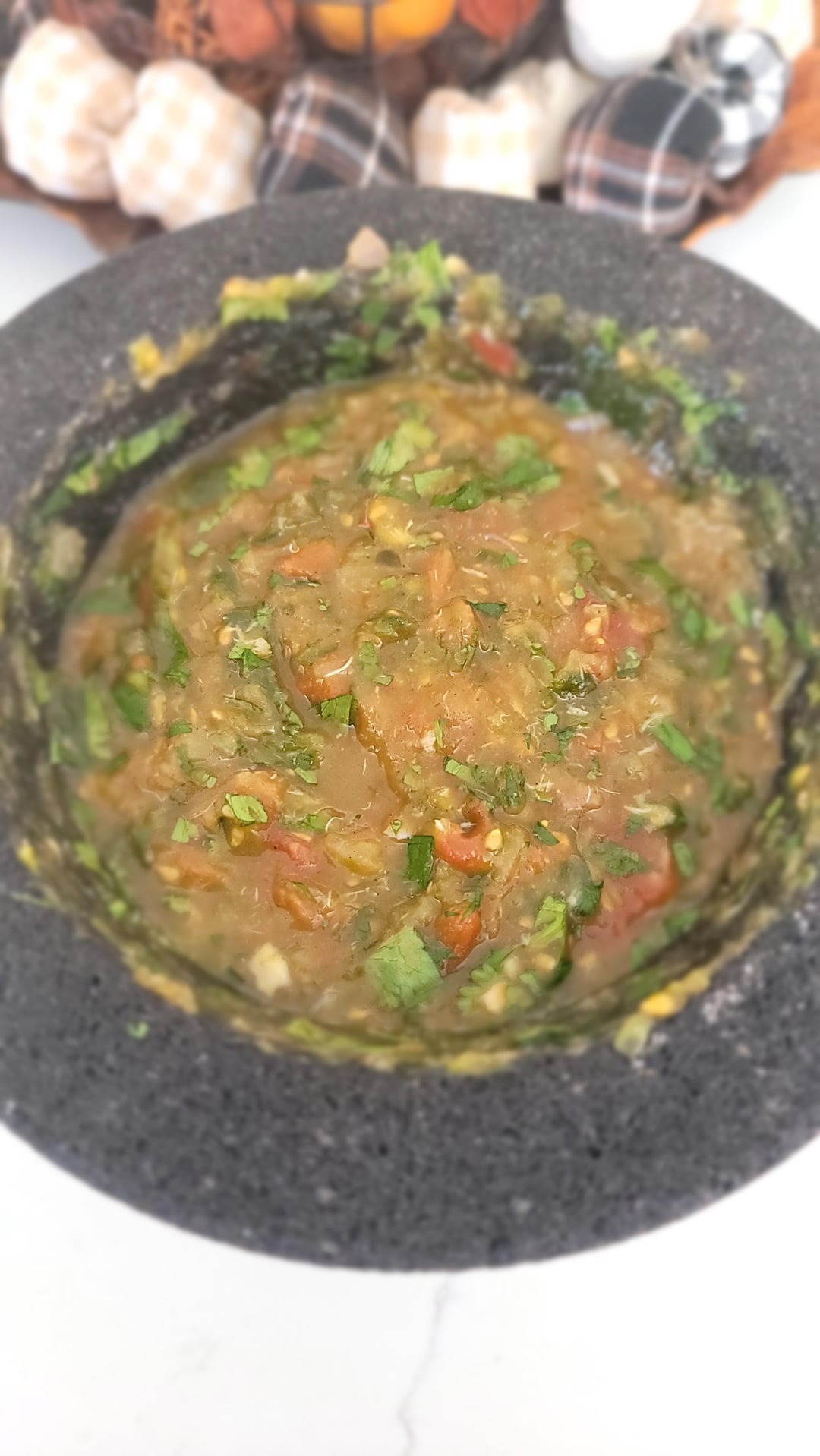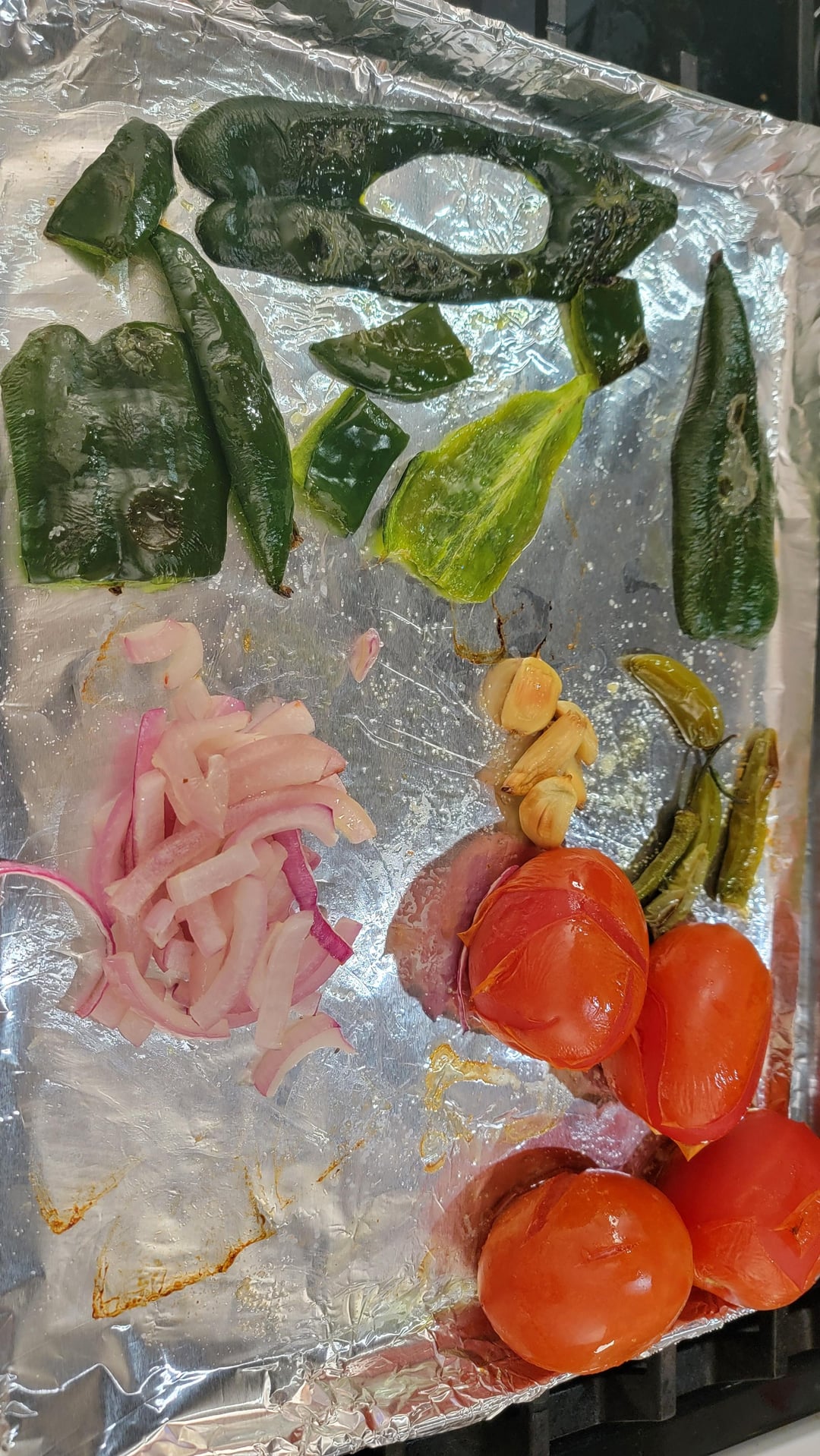 Brush peppers, onion, tomato, and garlic with oil and salt lightly. Roast until browned. Rough chop peppers, mash with garlic and onion in molcajete. Mash one tomato at a time. Mix in cilantro, lime juice, and salt to taste.