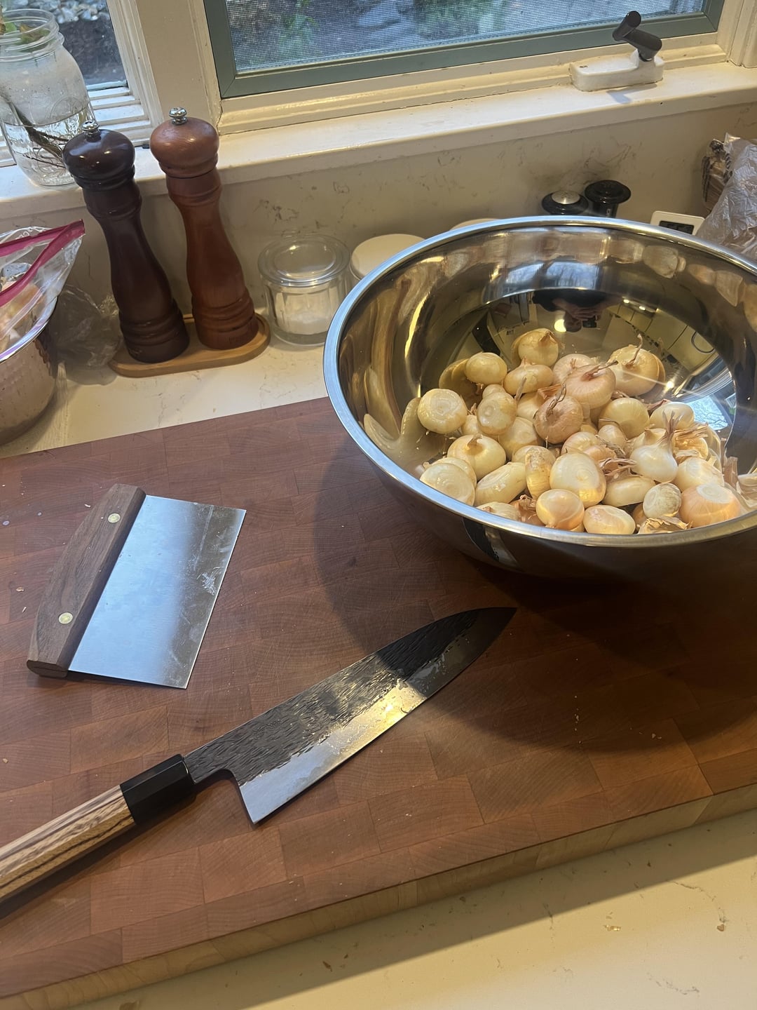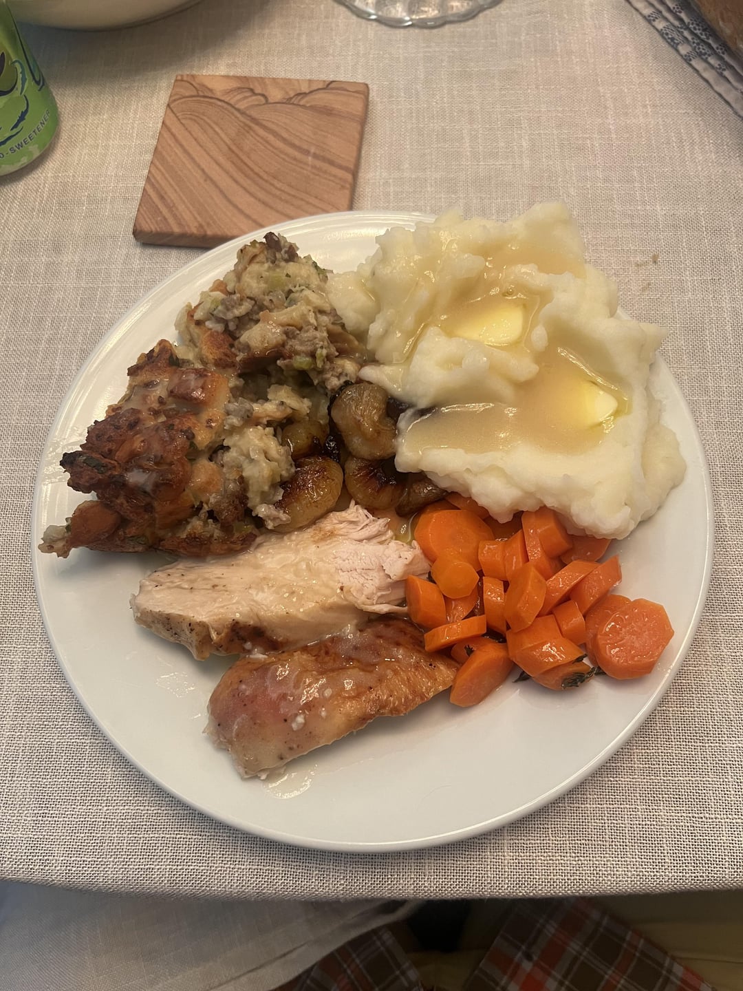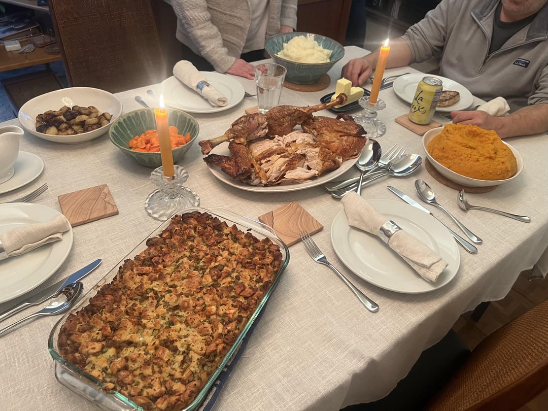 Spatchcock turkey, and gravy from the neck/spine/giblets. Mashed sweet potatoes with a little maple syrup. Light and fluffy mashed potatoes. Roasted cipollini onions. Glazed carrots. Classic sage and sausage stuffing. Stuffing was the talk of the table but the onions were the wife’s new absolute favorite. Thanks Kenji!