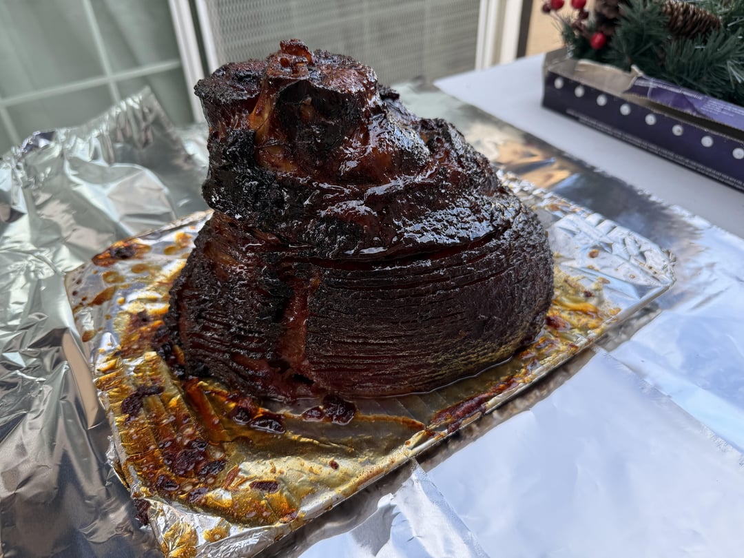 10 lb Costco presmoked ham. Followed Meat Church’s YouTube recipe for a double smoke and added a glaze that consisted of brown sugar, honey, cherry preserves, mango habanero pepper jelly and Buffalo Trace bourbon. Took about 4.5 hours but turned out amazing!