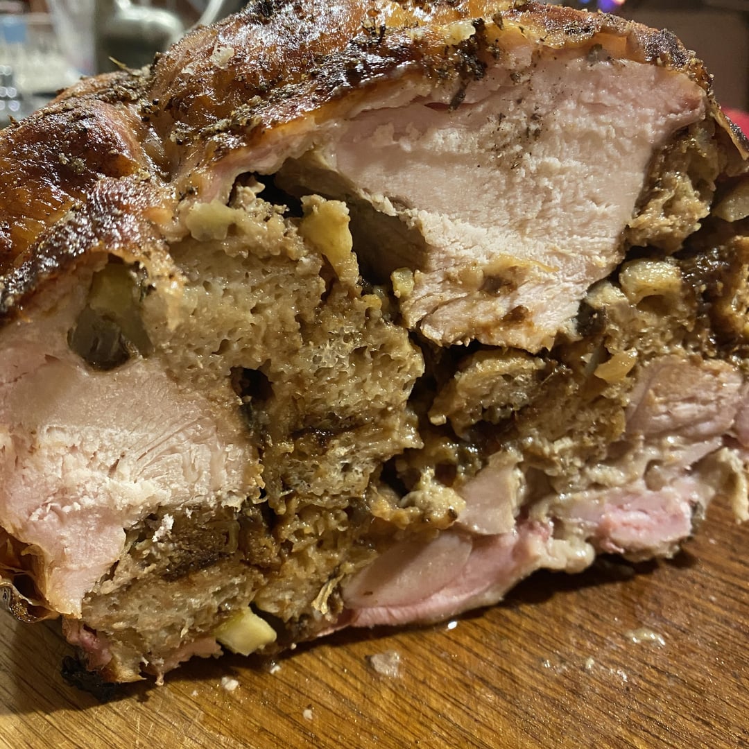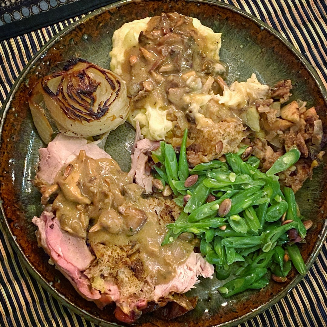 well seasoned, flavorful brine for 12 hours. Before rolling it up and trussing it I spread a layer of stuffing. A cross cut shows the stuffing “vein” running through the meat. Guests consistently claim it’s the best turkey they’ve ever had! Cooked on a Traeger Ironwood low and slow at 165/Super Smoke for about two hours. Then gradually ramped up to 350 over 3 hours until internal temp of 165.