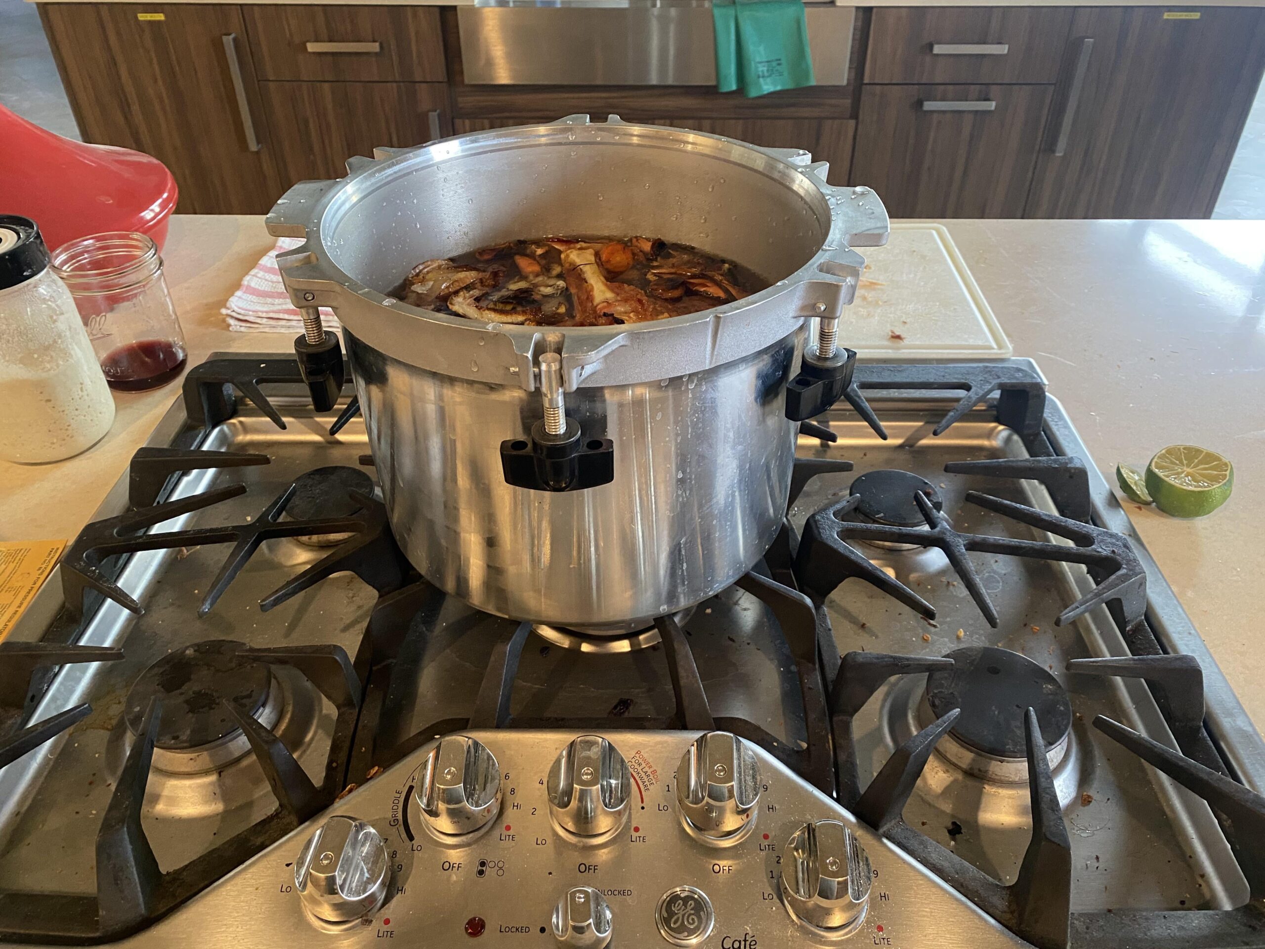 I found myself in possession of a lovely turkey carcass today, as well as a freezer bag full of vegetable trimmings. My smaller All-American has been pressed into service as a pressure cooker. After the resultant stock cools in the mud room overnight (it gets as cold as our refrigerator out there this time of year) and gets defatted, I will pressure can the resultant stock tomorrow.