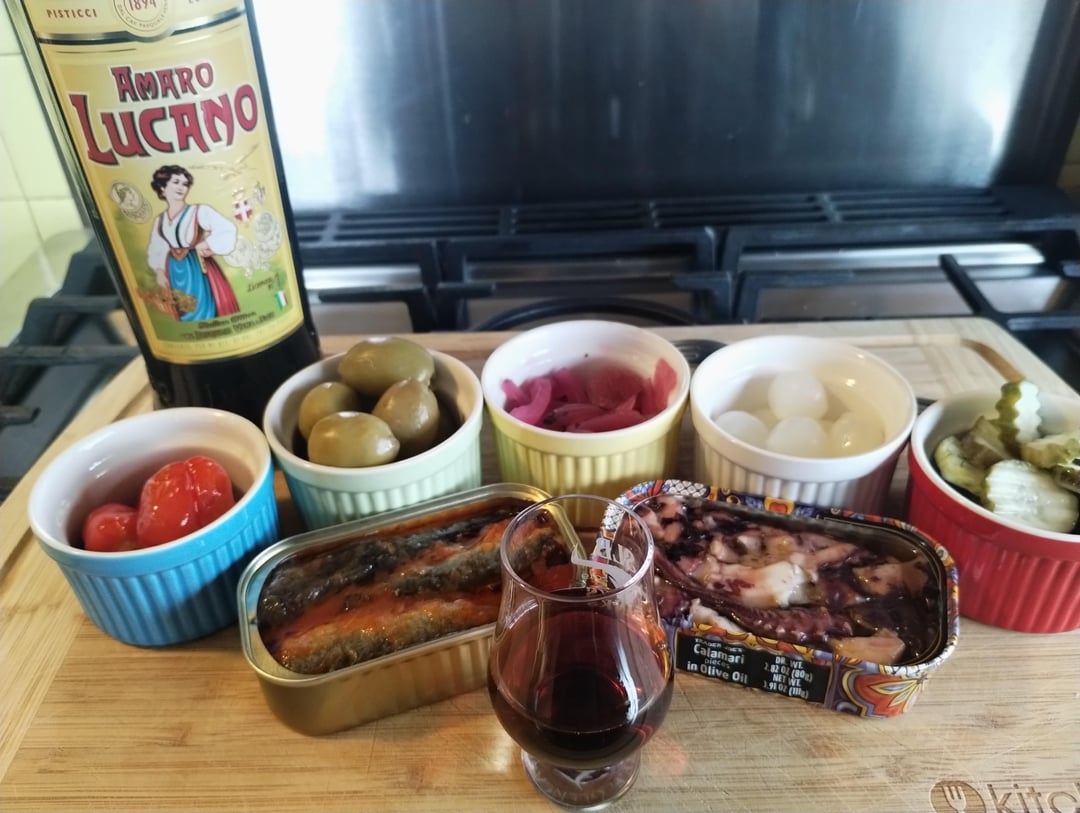 This sub brings a lot of Nuri hype so I figured my first try of the spiced sardines in tomato sauce should be straight from the tin. This was accompanied by some Trader Joe's Calamari pieces in Olive Oil, picante peppers, olives, pickled red onions, cocktail onion, pickles and we pour of Amaro Lucano.