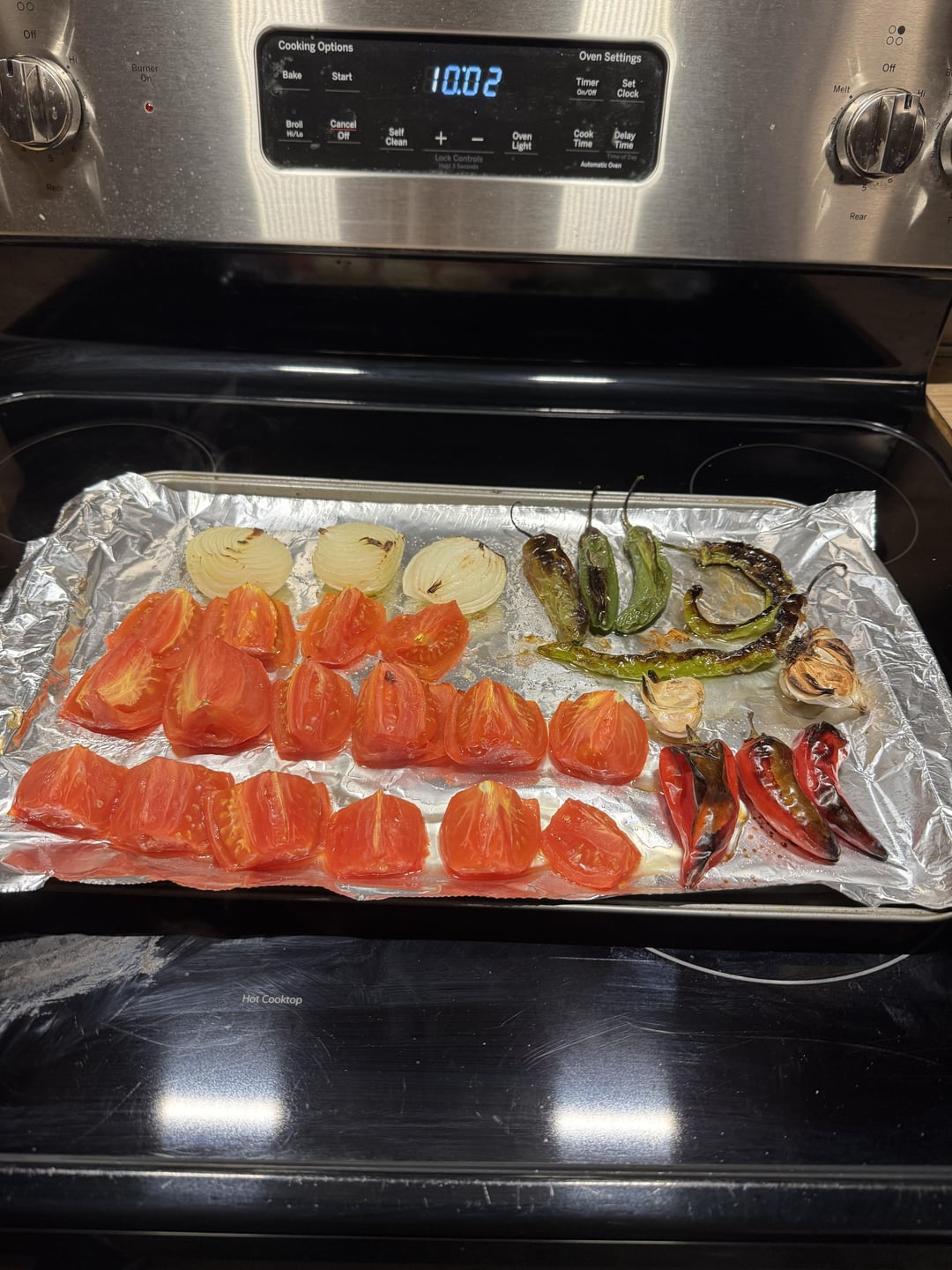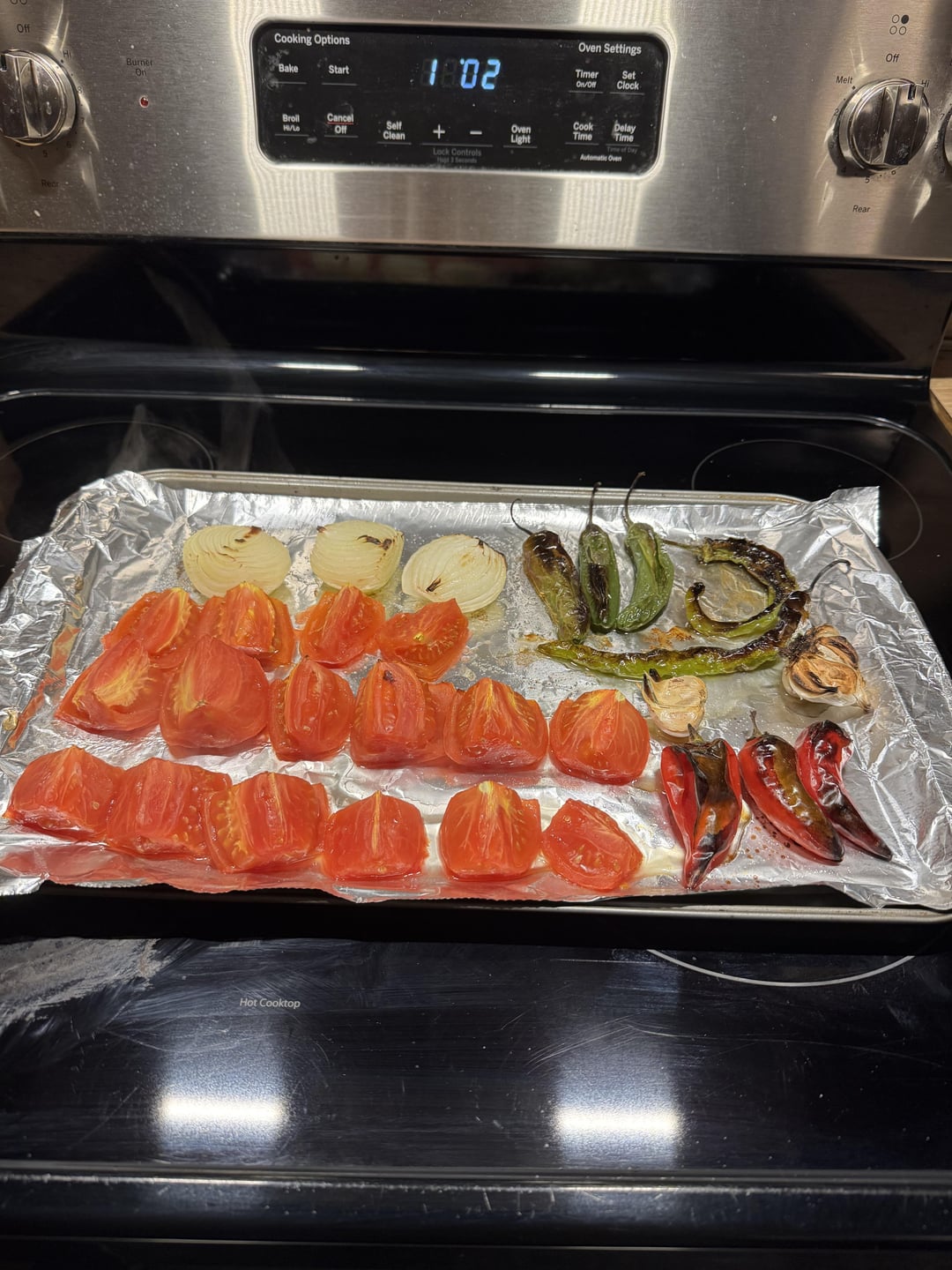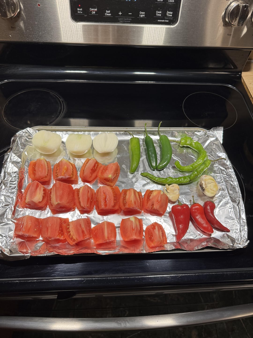 Five Roma tomatoes, 2 small white onion, 3 Serrano pepper, an ass of garlic cloves and some random peppers out of my uncles garden. I asked what they were and he said “hot chile peppers.” I added salt, ground pepper, cumin and a packet of sazon. This was actually pretty hot. Especially if ya eat on it. I’m a fan but the family is not. To hot apparently. I did roast most of the veggies. Very good when i sampled it. Ready for rivalry games tomorrow!