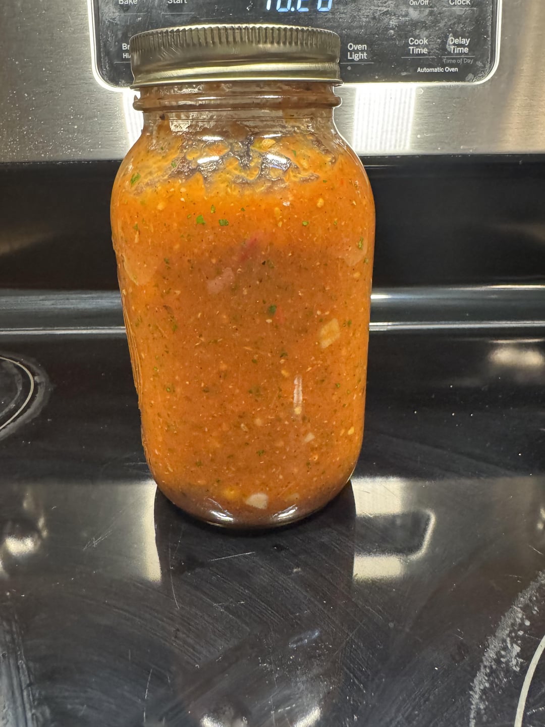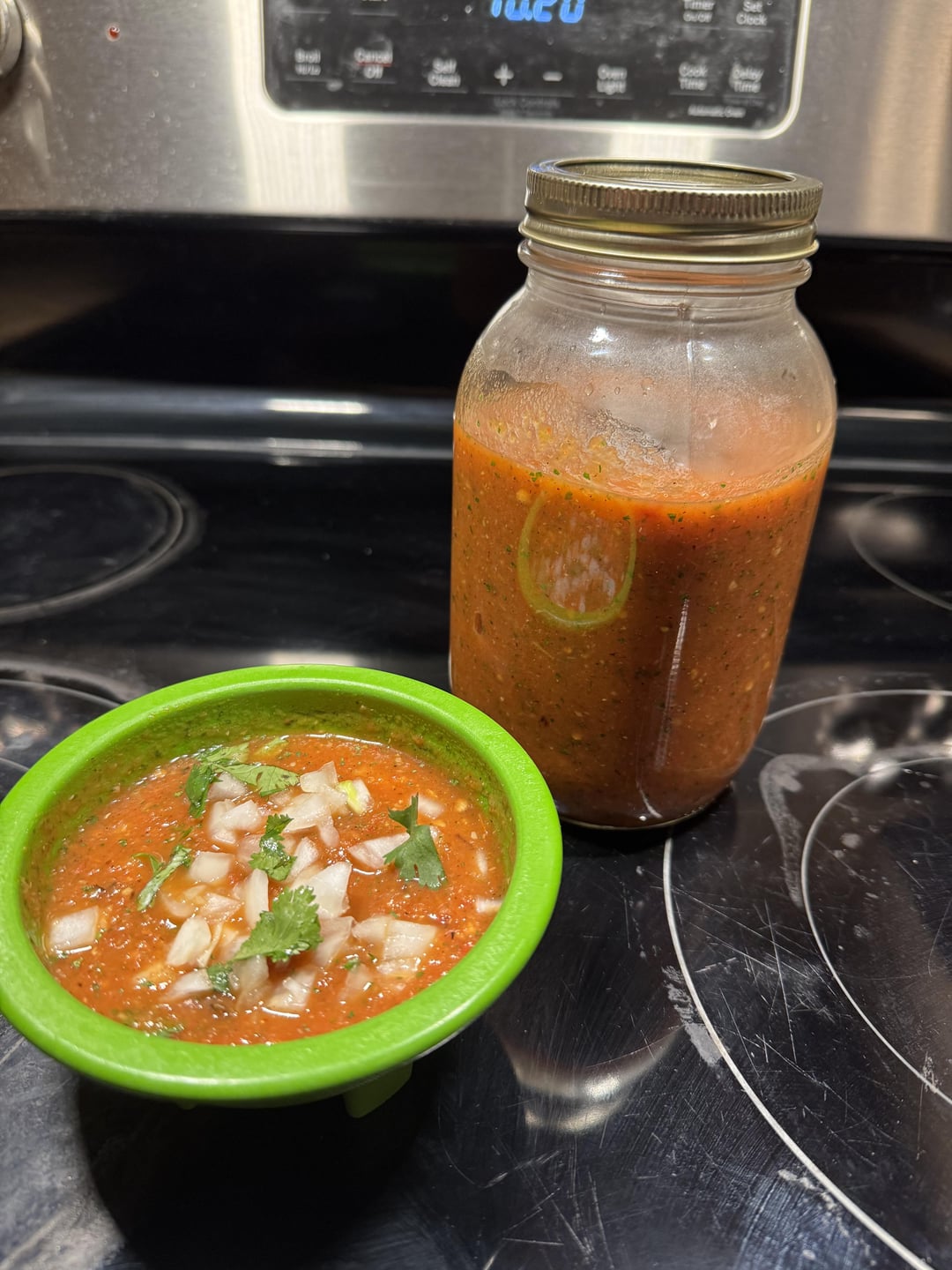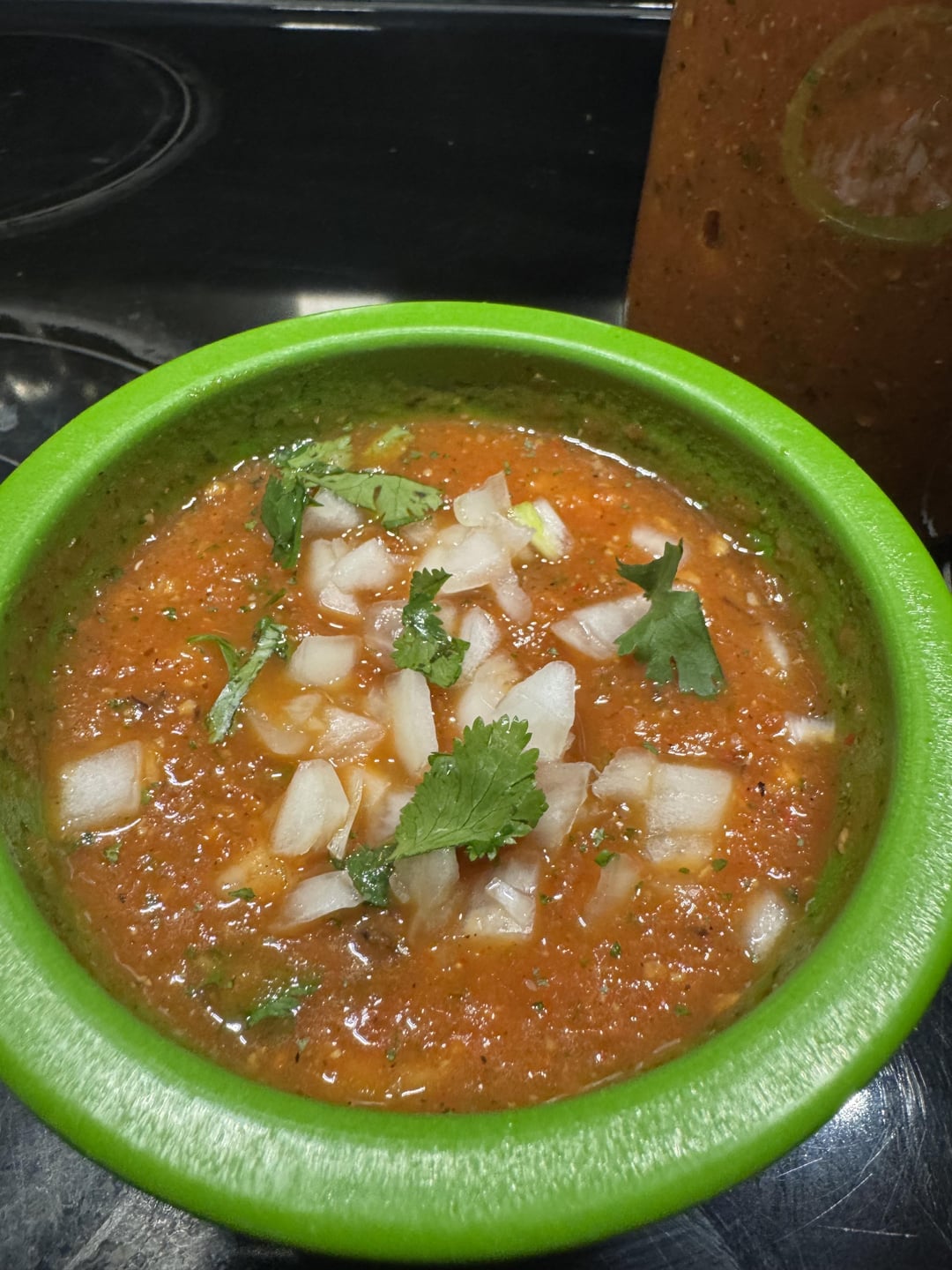 Five Roma tomatoes, 2 small white onion, 3 Serrano pepper, an ass of garlic cloves and some random peppers out of my uncles garden. I asked what they were and he said “hot chile peppers.” I added salt, ground pepper, cumin and a packet of sazon. This was actually pretty hot. Especially if ya eat on it. I’m a fan but the family is not. To hot apparently. I did roast most of the veggies. Very good when i sampled it. Ready for rivalry games tomorrow!