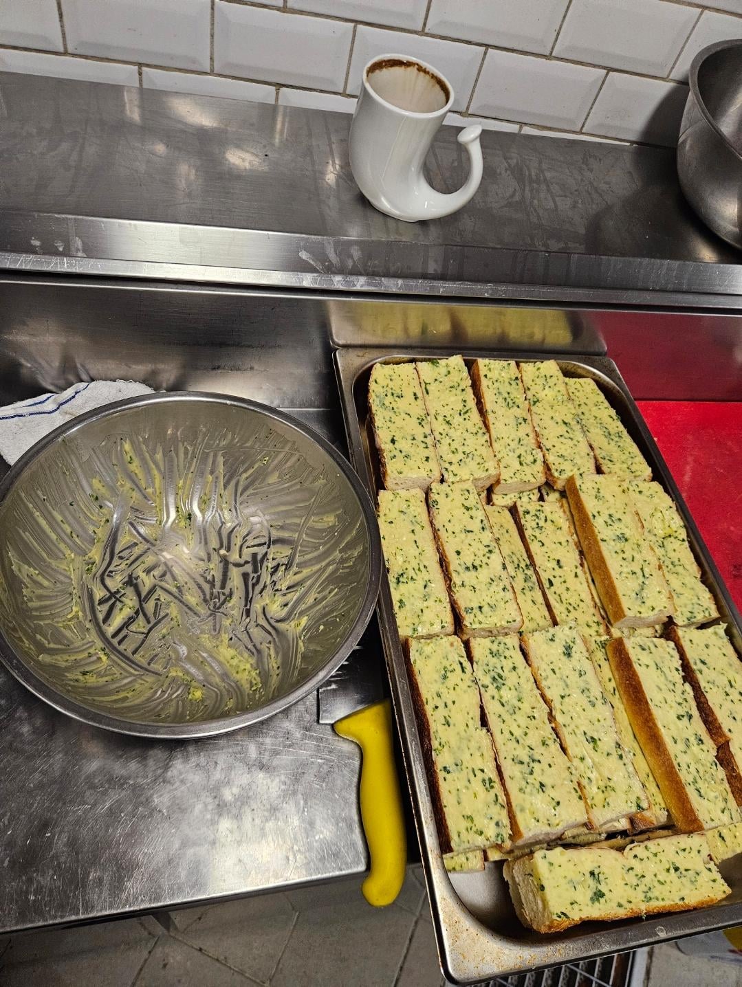 Be mindful where you are setting down your knives when busy. I learned the hard way. Nice baguettes. Are those going in the salamander to order or …?