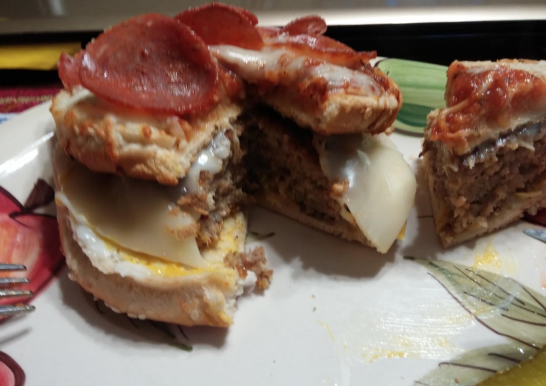 Fried egg bacon burger. Inverted the top bun and made it in to a pepperoni pie.by HazMatt666 2 Comments kat-eladrin 10 months ago *crying in Italian* H_O_M_E_R 10 months ago Did you cut a slice out of it like a savage?Write A CommentYou must be logged in to post a comment.