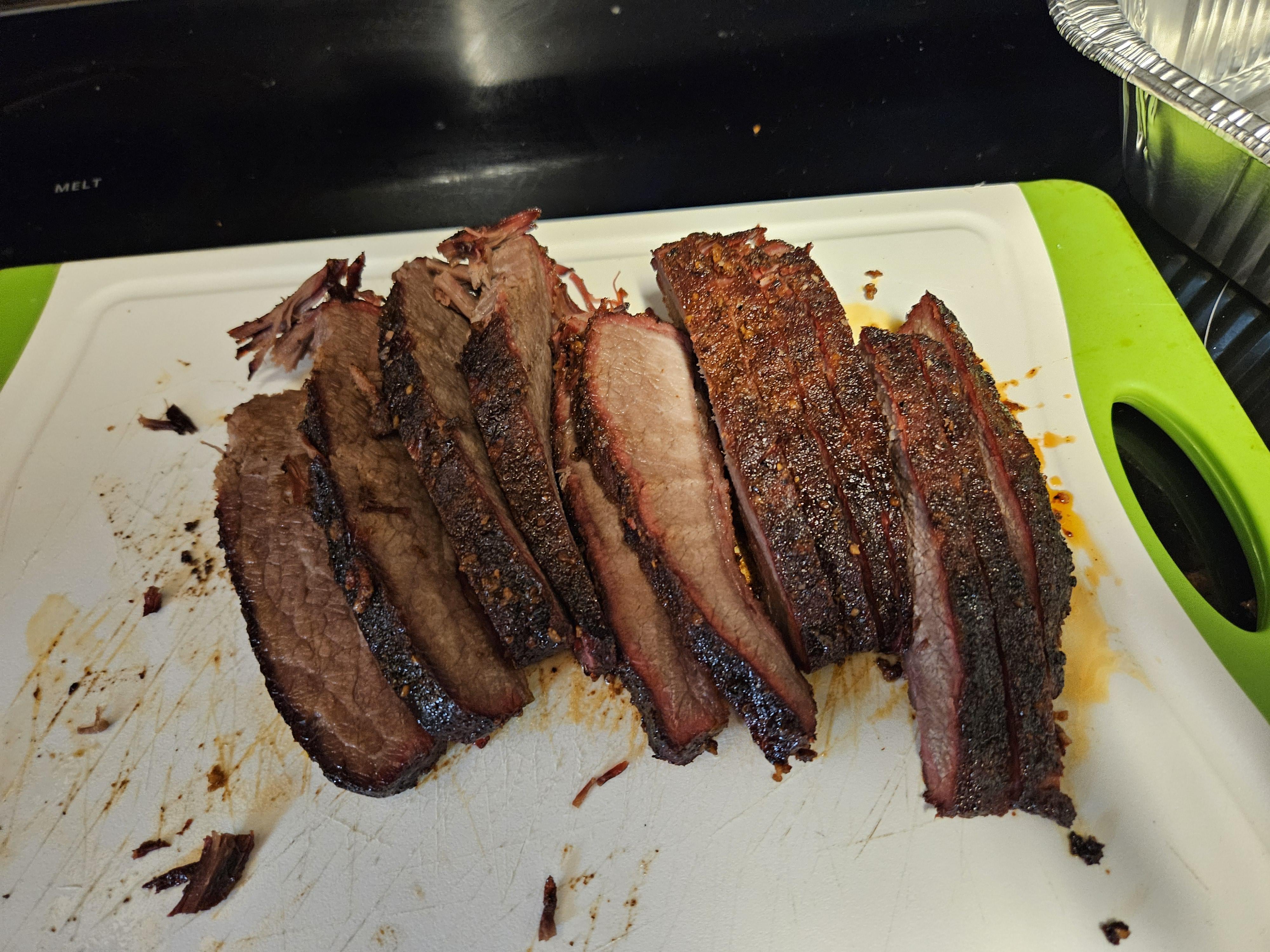 Just finished my first brisket. It was only a 2lb flat but for the price I couldn't resist. The grocery store had it marked down to $6.60. Cma out pretty tender and juicy. Smoked at 225 until bark was set then bumped to 270 until probe tender.