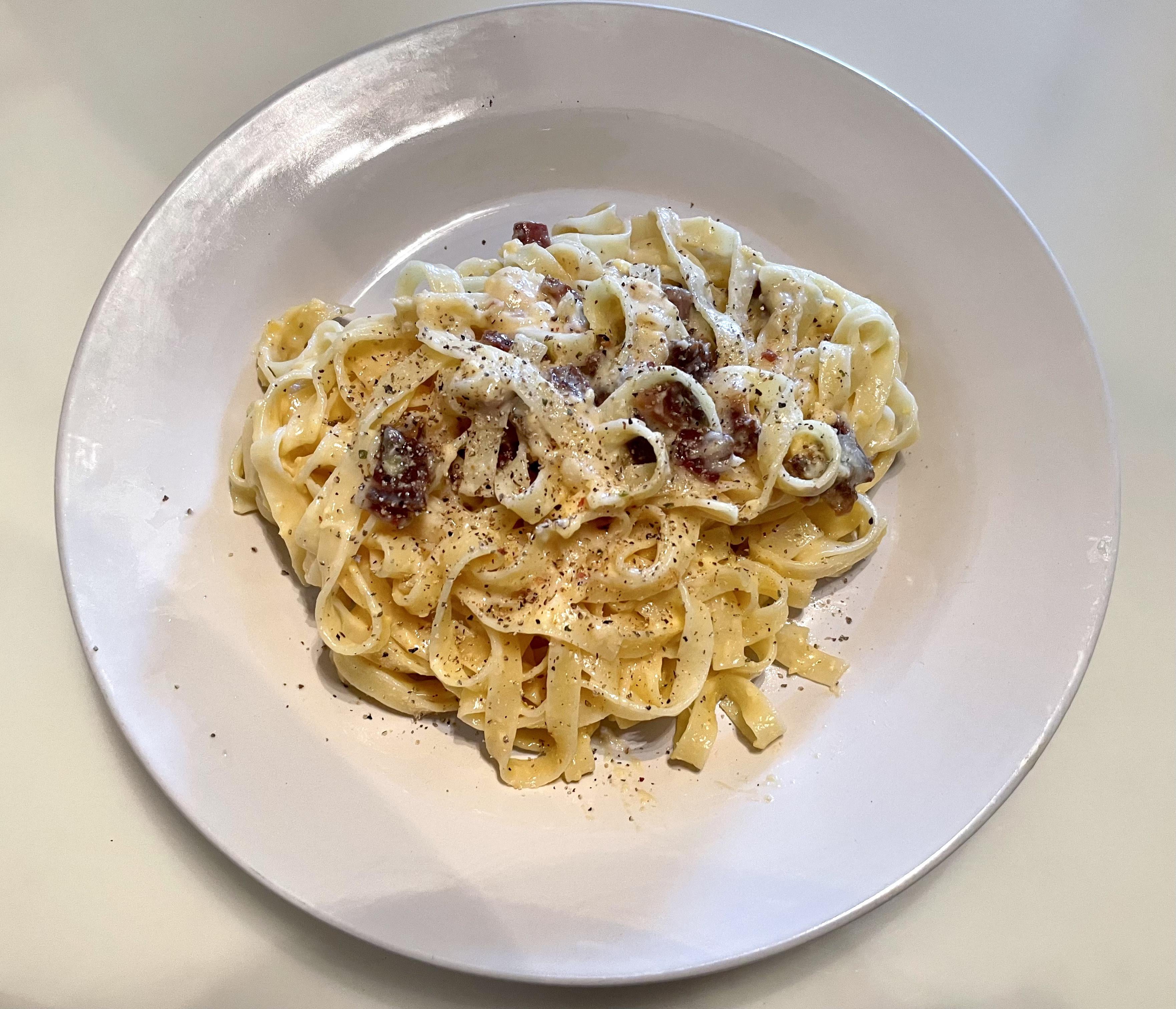 Two egg yolks and shredded parimigano are prepared, while 250g of pasta is cooked. Pancetta sautéed in a pan, and the cooked pasta is added to it. After turning off the heat, the egg and cheese mixture is stirred in, followed by a sprinkle of black pepper.