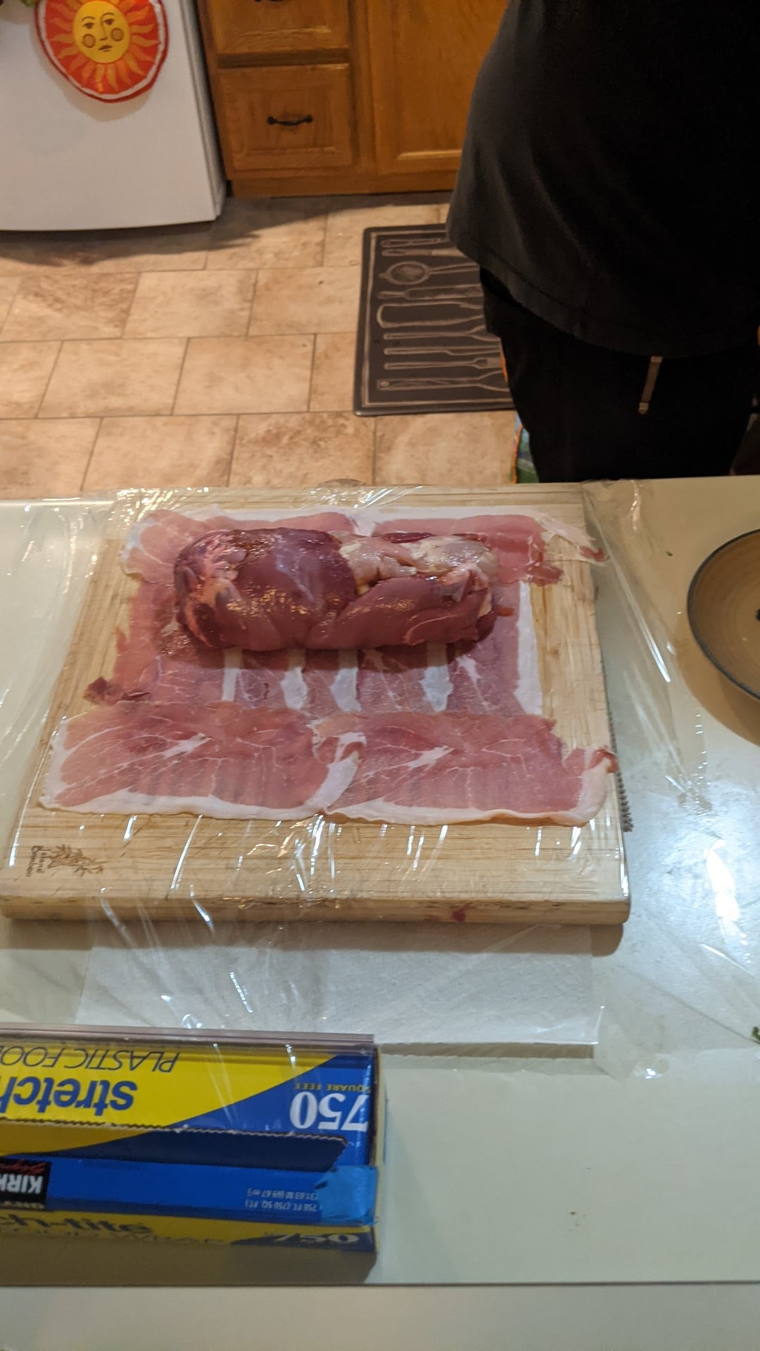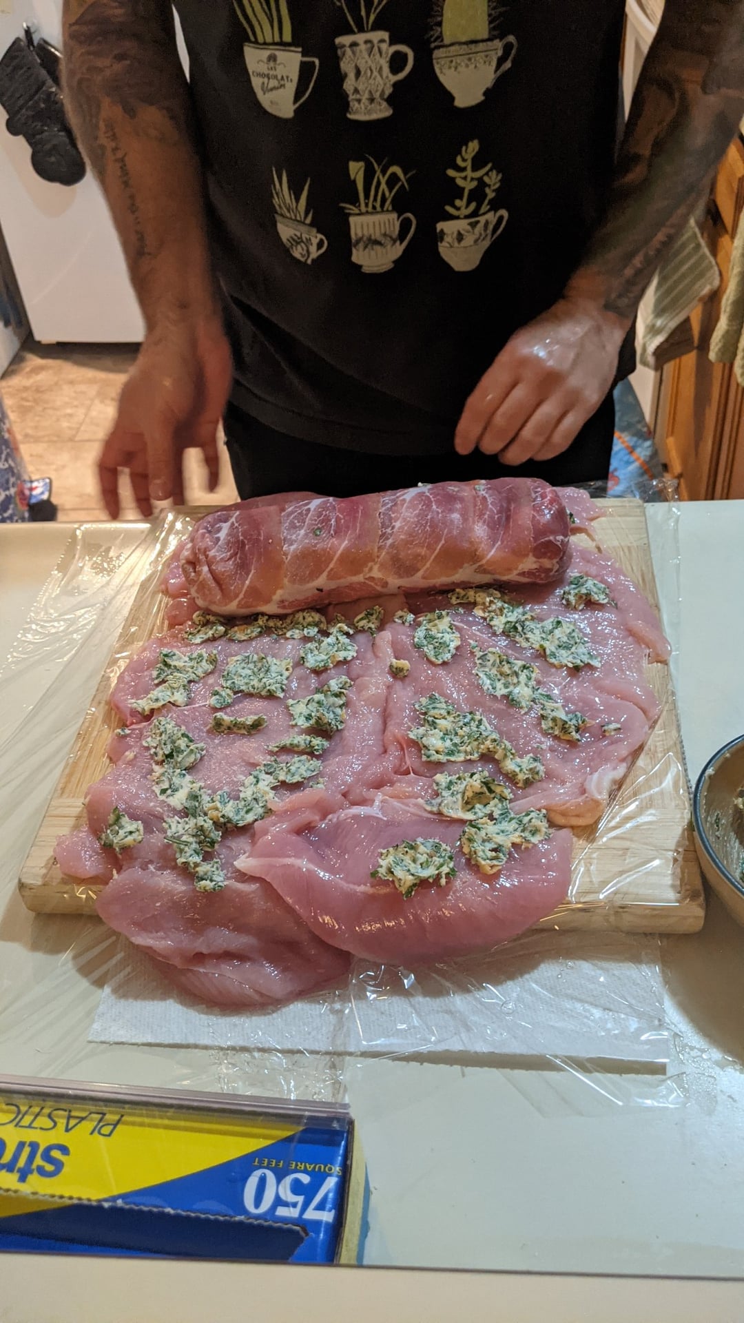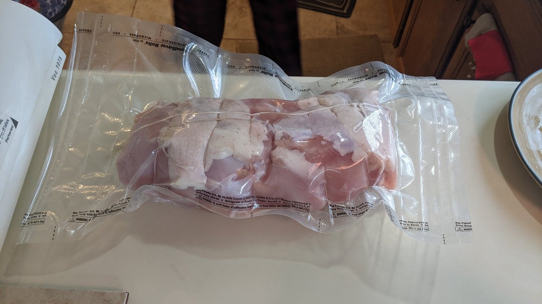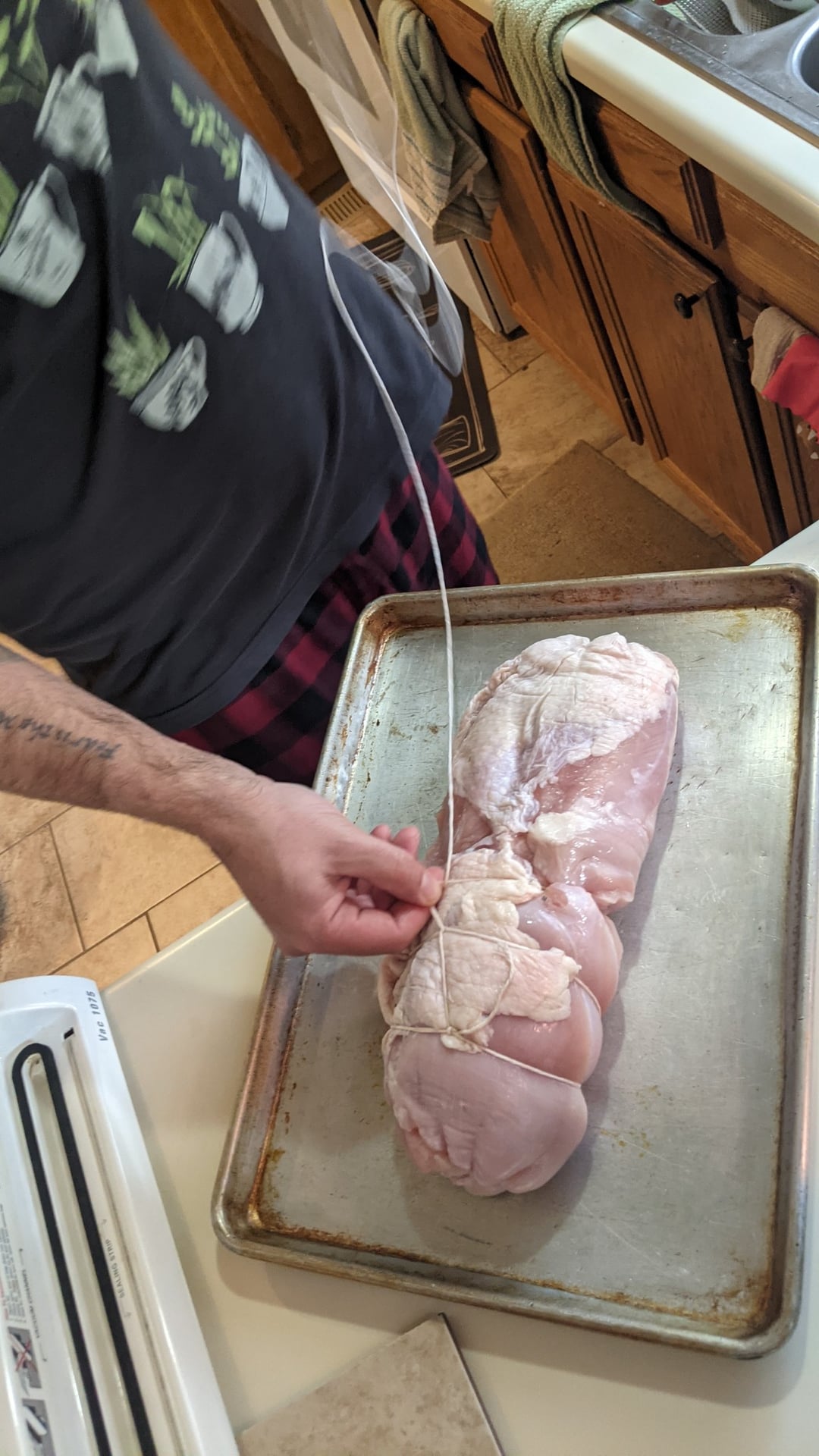 I made a Turducken roll! Sage butter chicken, orange and brown sugar duck wrapped in prosciutto and lemon + herb w/ confit garlic turkey. 8 hours at 150f
