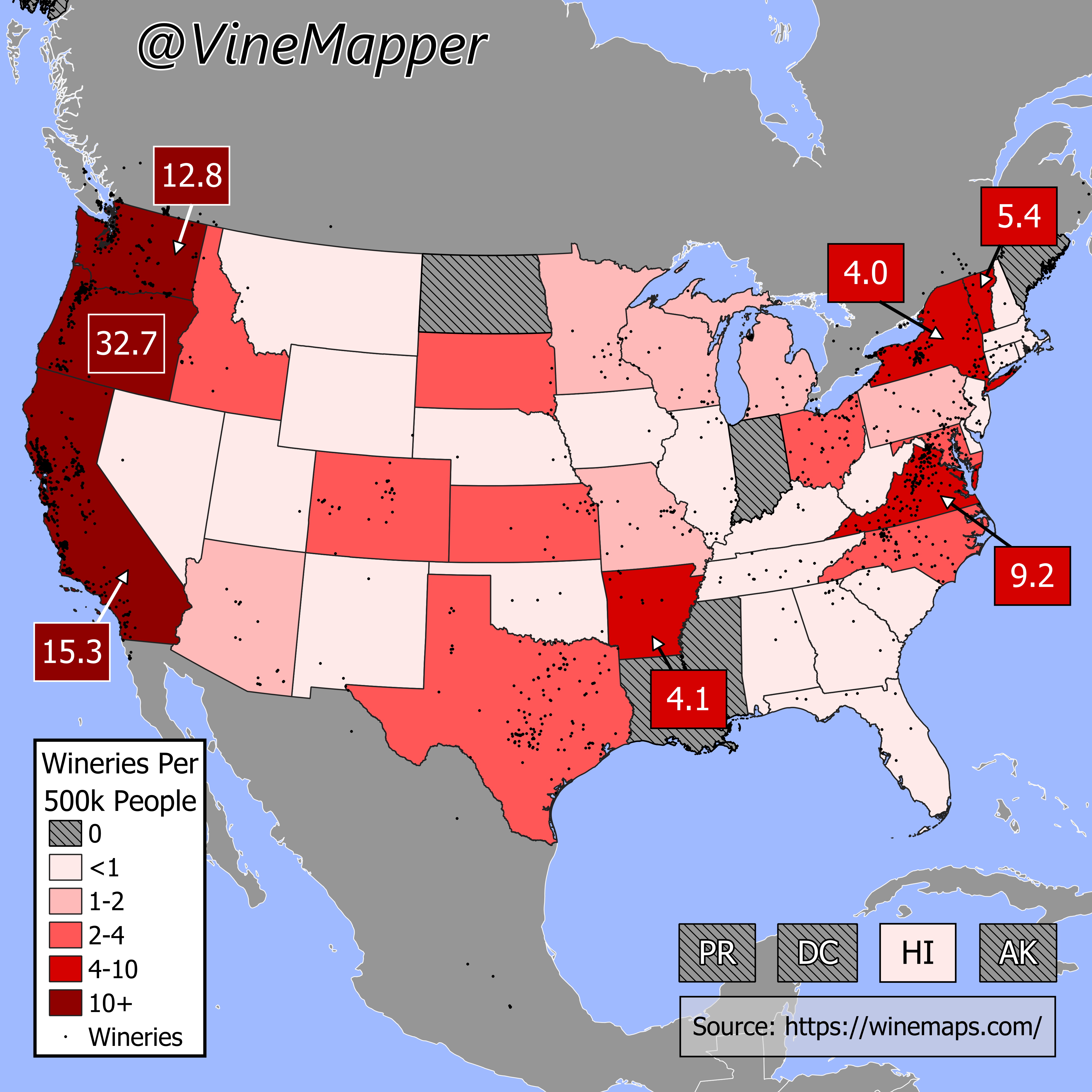 There’s 700 wineries in South Australia and we have 1.85m people.. soo 189 per 500k here if I’ve mathed correctly.