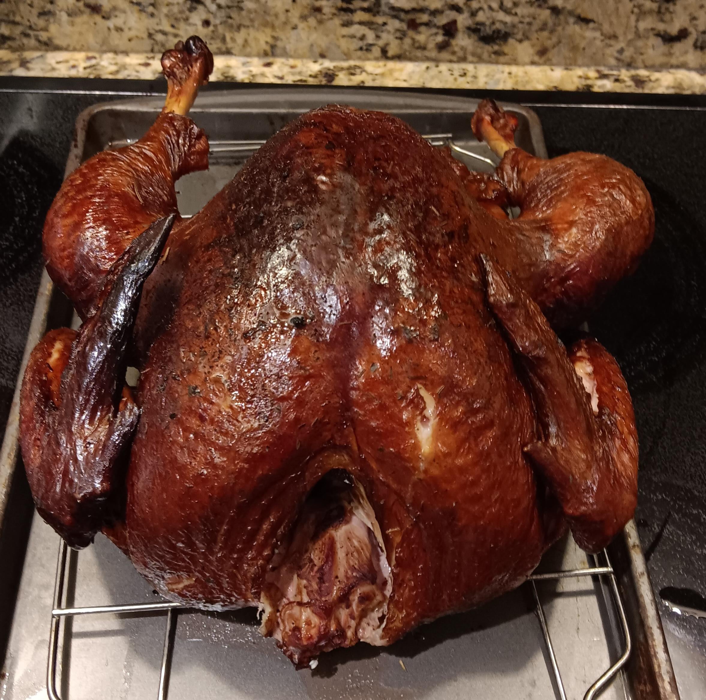 My parents can no longer travel.. so tomorrow we are bringing them Thanksgiving dinner and I just pulled the bird off the 26er. 10 lbs… dry brined 2 days… some cherry and pecan smoke… not a lot…. grill kept steady at 350 degrees. 2.25 hrs to cook it.
