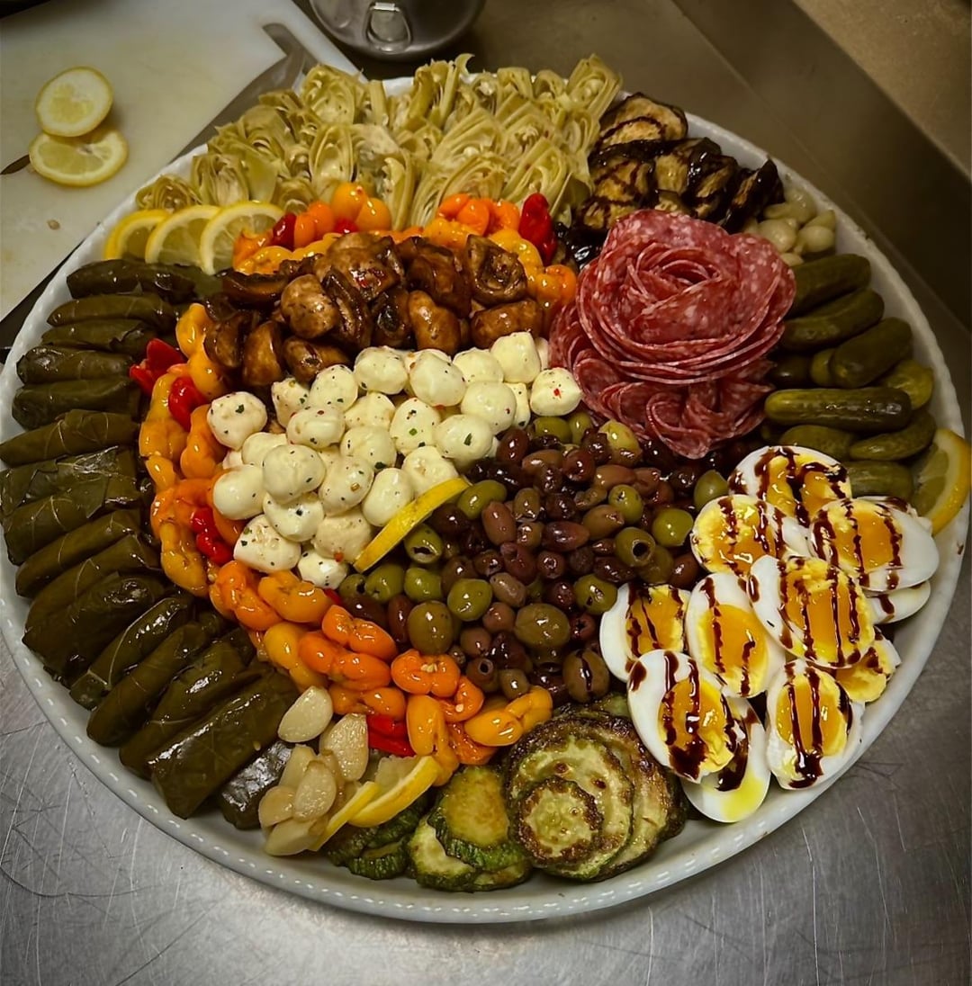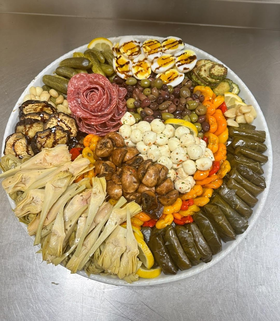 Only suggestions I have is perhaps a bigger platter for more spacing? I know a lot of people that are weird about their food touching. The second thing I would say is maybe the color balance? Eggplant is fantastic, but perhaps some lemon wedges would be a nice touch especially for the stuffed grape leaves (🤤) in the first picture or some yellow squash and toast points or pita in the second?