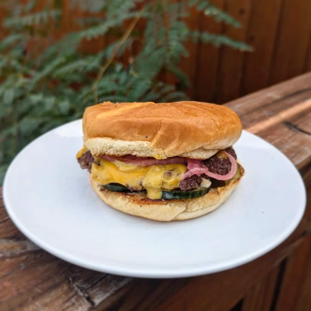 Lost-in-Austin: 4oz smash burger with La Barbecue pickles and pickled onions, Hill Country American cheese, Kewpie mayo, and Acid League deli mustard on a toasted Mrs Baird’s bun