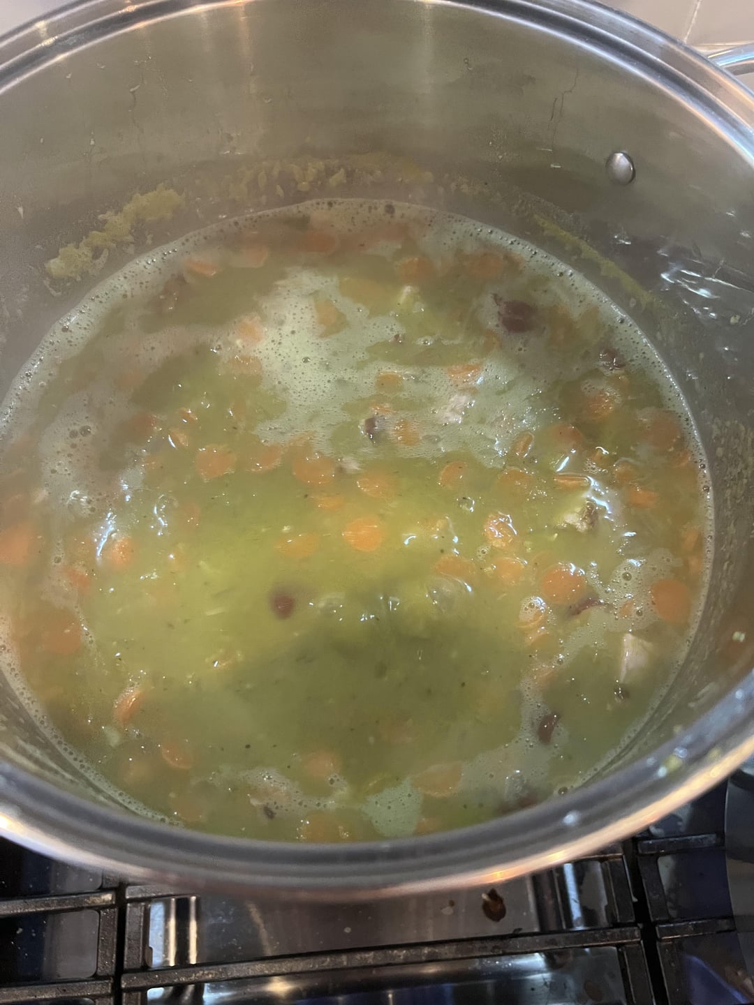 Used up left over ham to make soup, split green peas, carrots, onions and ham. Tastes better than it looks.