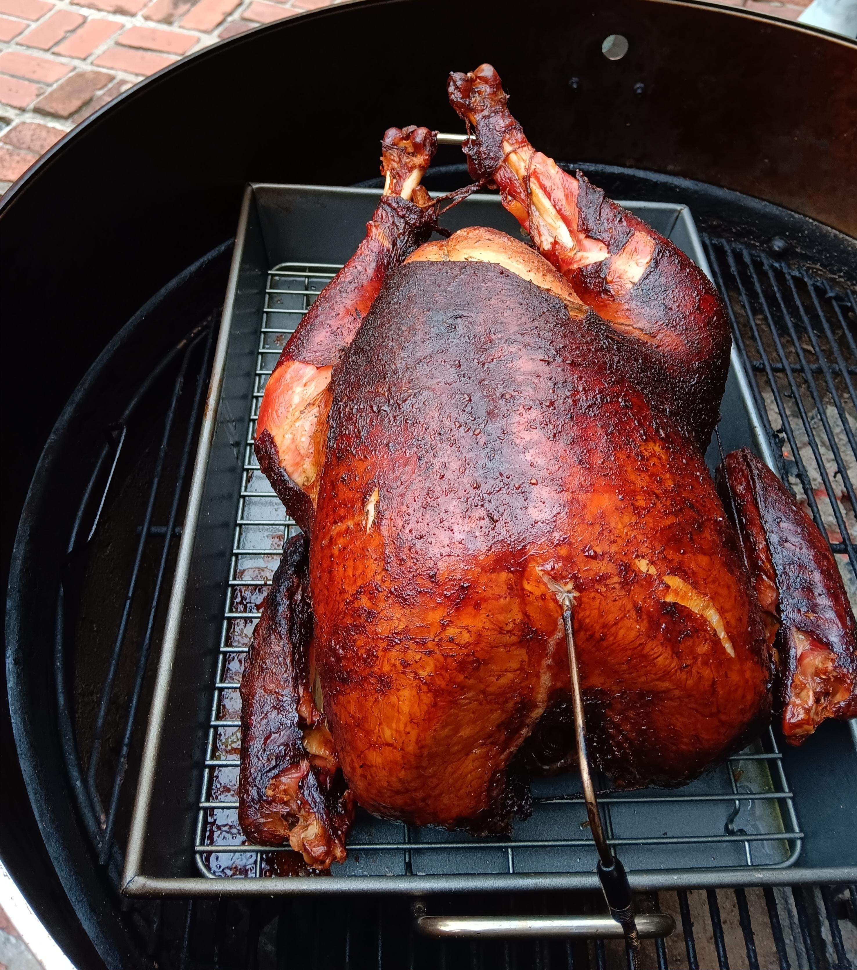 The motor on my rotisserie quit when the turkey hit 140 degrees… so I pulled it off the spit and pulled the rotisserie forks out… dropped it in the roast rack/roast pan to finsh…. pulled the turkey off at 160 degrees… 20 pound bird only took 3.5 hours at 350 degrees (dry brining or wet brining speeds up the cook). This bird had a little bit of pecan and cherry wood smoke on it dry brined for days… The flavor was fantastic…very tender… not dry at all… it was a hit.