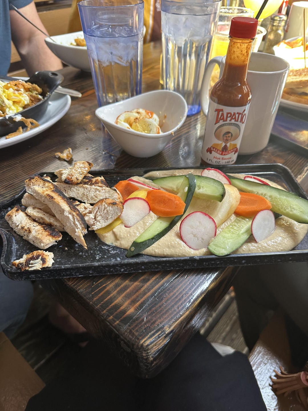I had two hard boiled eggs but only ate the egg whites. I ate all the chicken, vegs, and around half ish of the garlic hummus. The second pic is what was left. Im thinking around 700 ish?