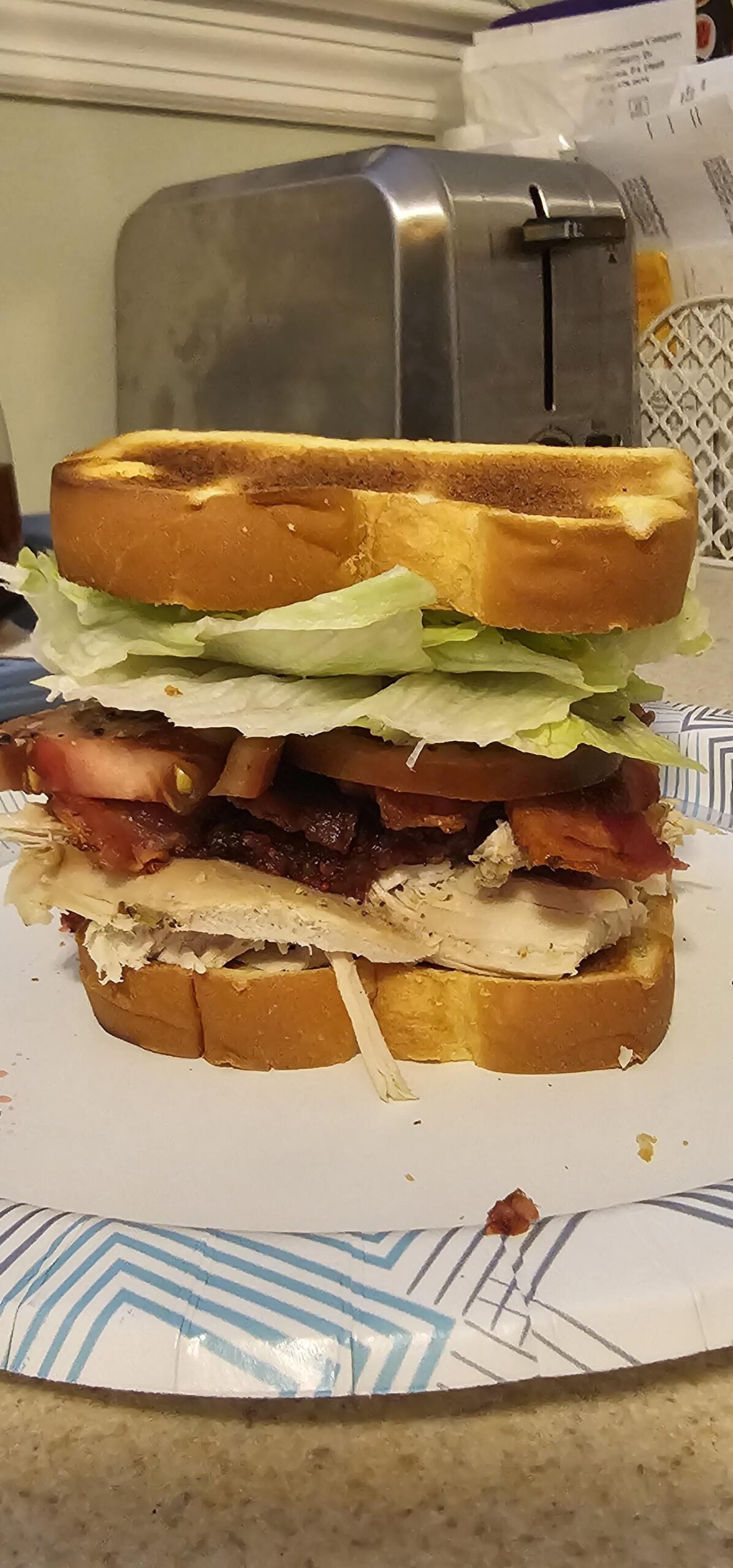 The layers are: (bottom up) toasted potato bread, kewpie mayo, smoked turkey, spicy cranberry relish, bacon, kumato brown tomatoes w/ s&p, celery leaves, iceberg, kewpie, toast. Sorry, no cross-section, wrapped it snugly in parchment and foil to-go.