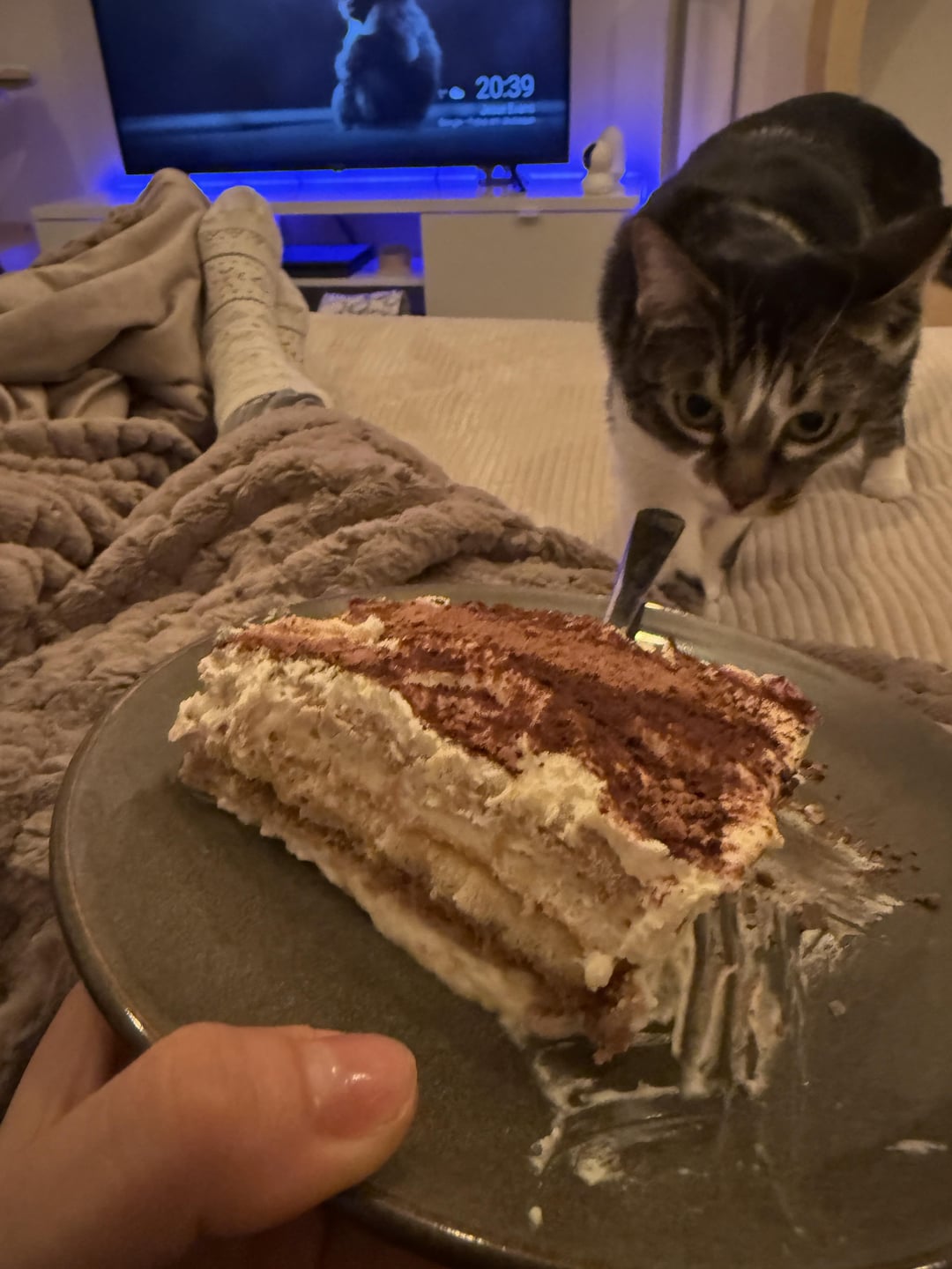 the cat is looking like it’s going to take care of those tiramisu calories for you