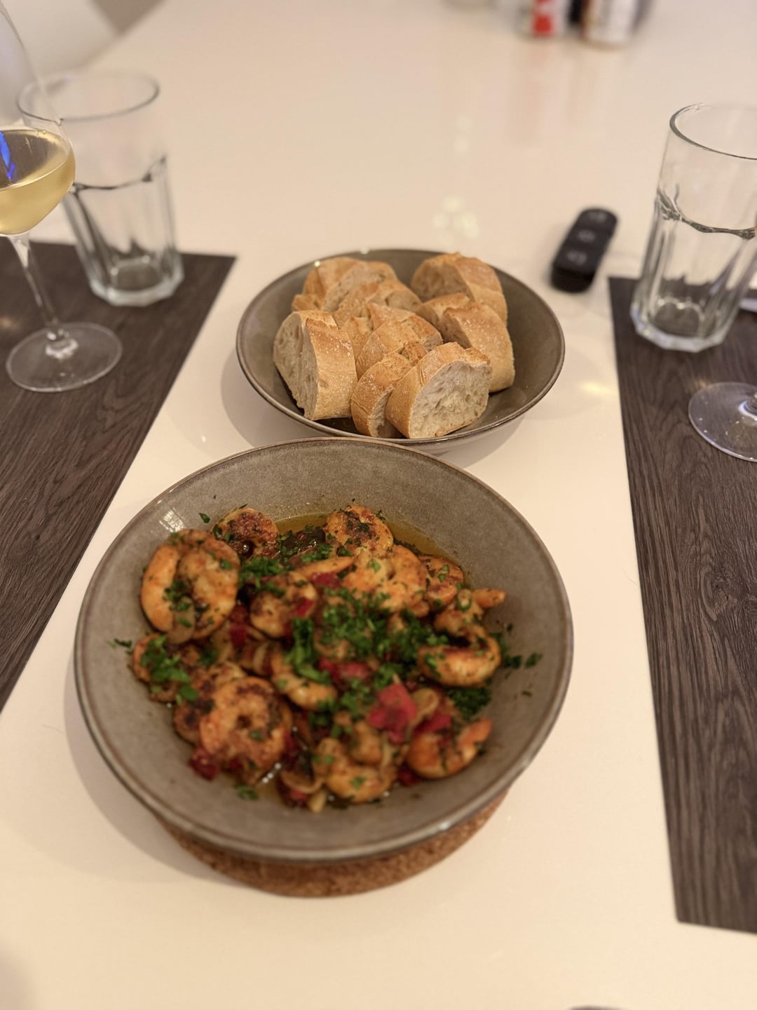I’d reckon 450 for the tiramisu, 0 for the cat (very cute), 700ish for the pasta (looks quite creamy), and for the prawns and bread, 400 and 300 respectively!