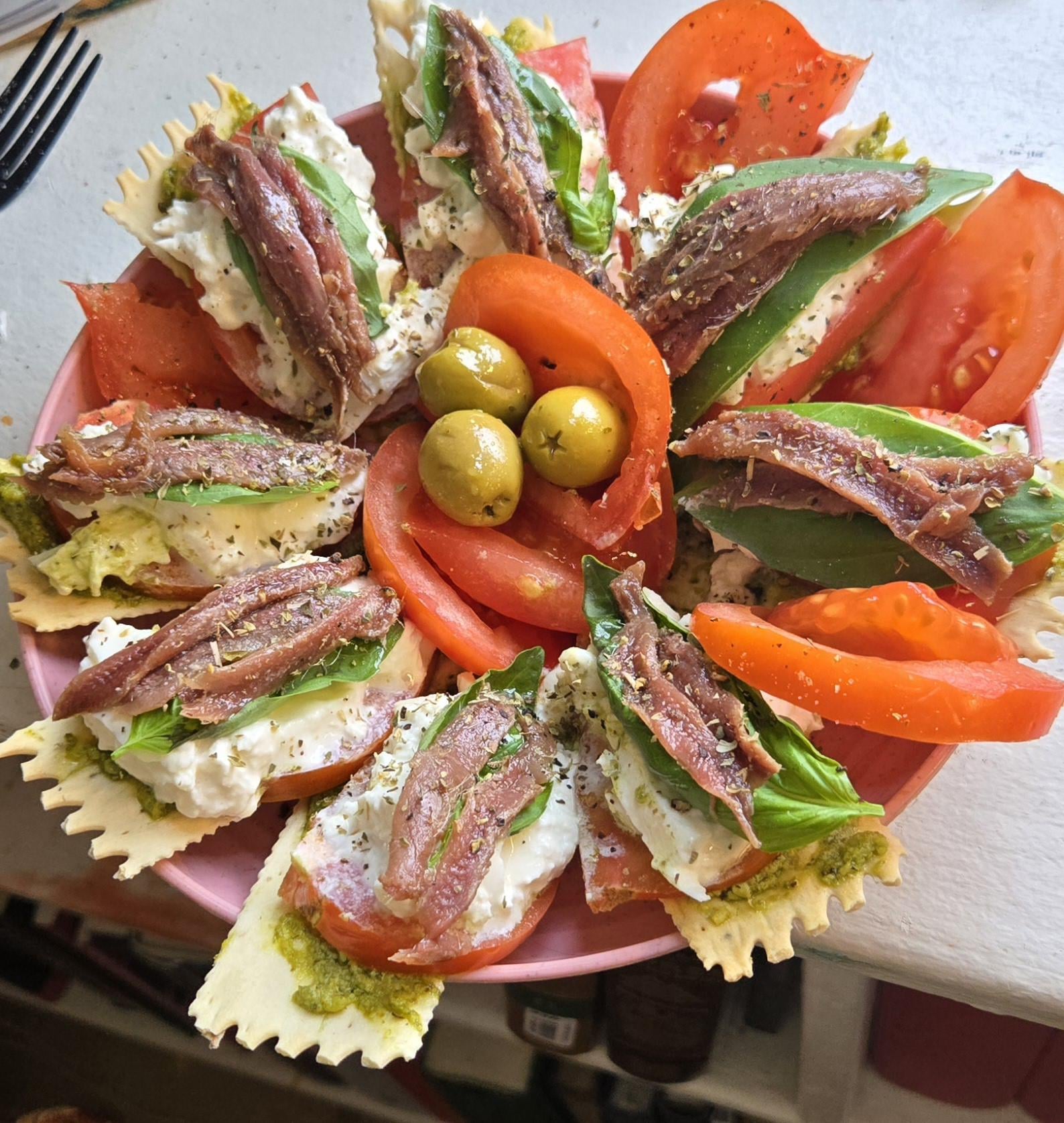 Please talk us through those layers a little more! Some kind of cracker, pesto(?), tomato, burrata, anchovies, then I see herbs? Did I miss something?