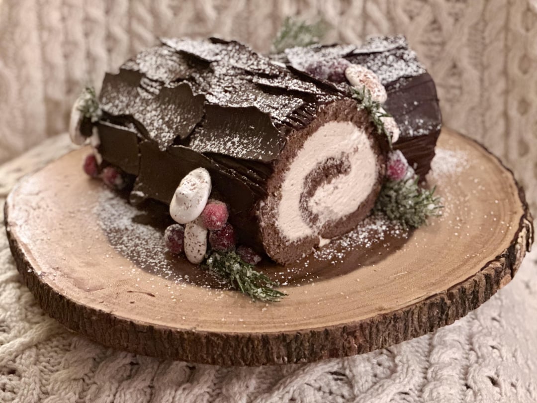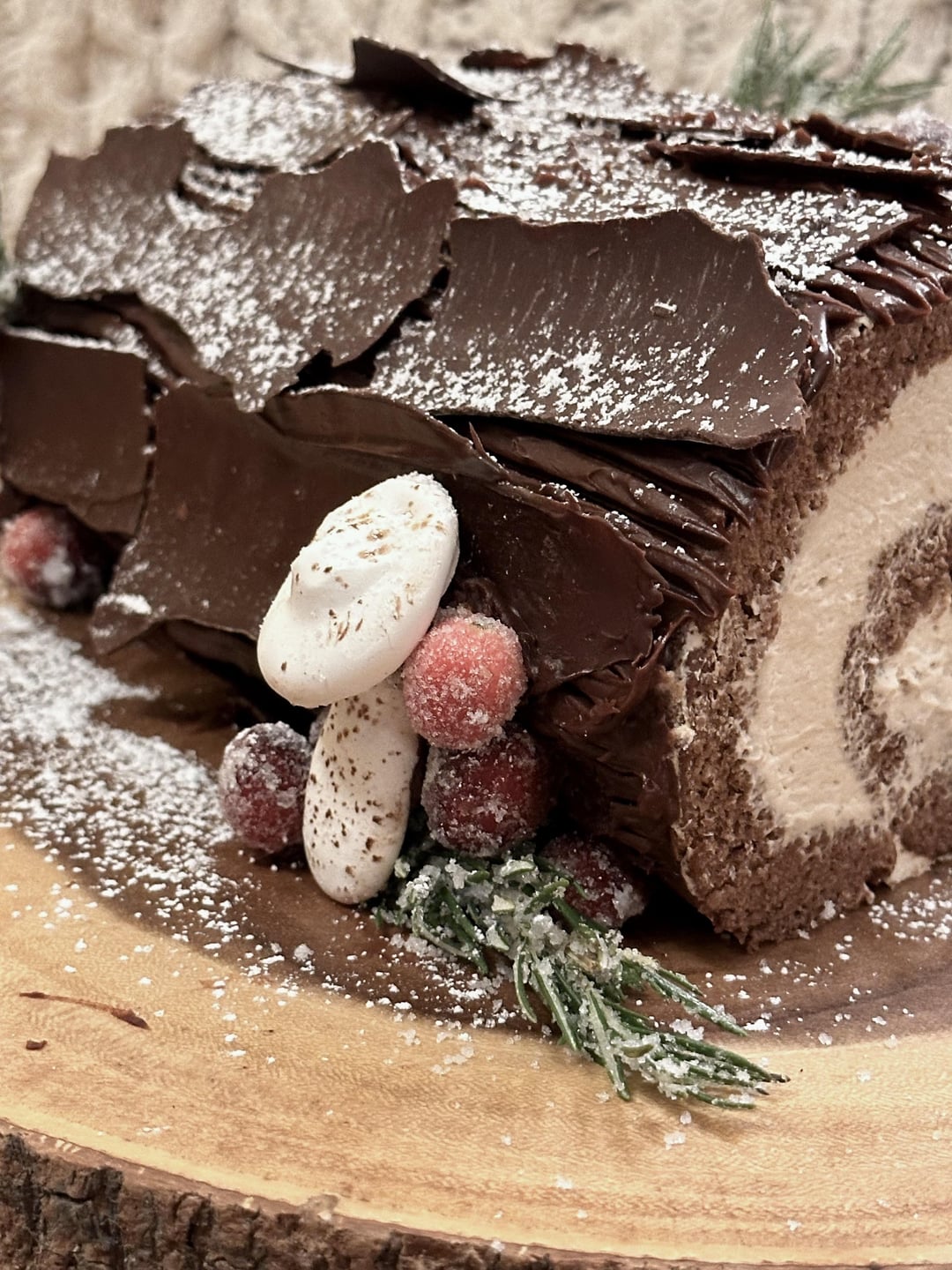 So itβs a chocolate chiffon cake, with a whipped mascarpone, maple cream, chocolate ganache, and bark coating decorated with Swiss meringue mushrooms, candied cranberries, and rosemary.