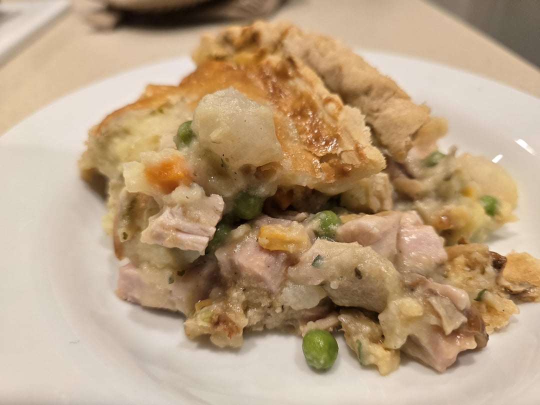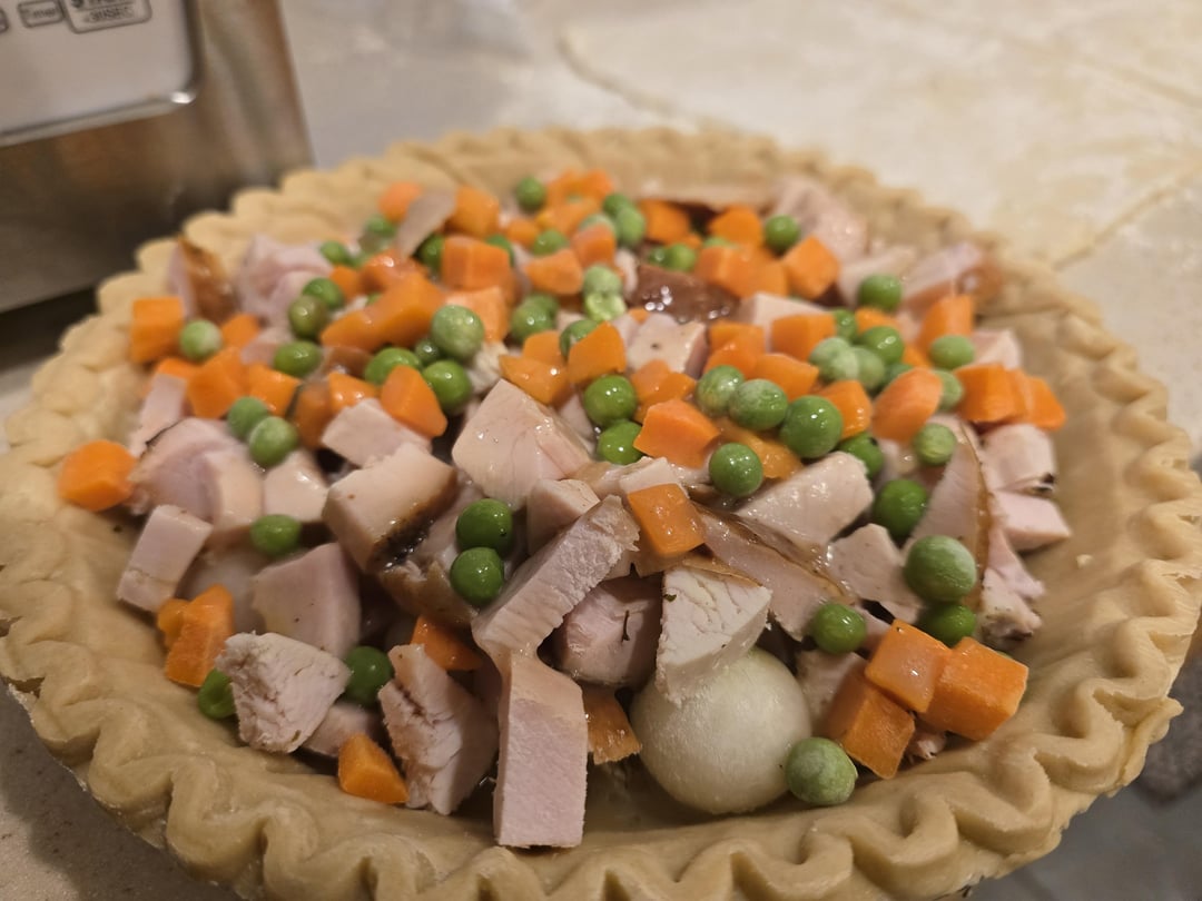 Leftover white meat, corn soufle, stuffing, gravy, mashed potatoes. Store bought crusts with egg wash. 350 for 45 minutes.