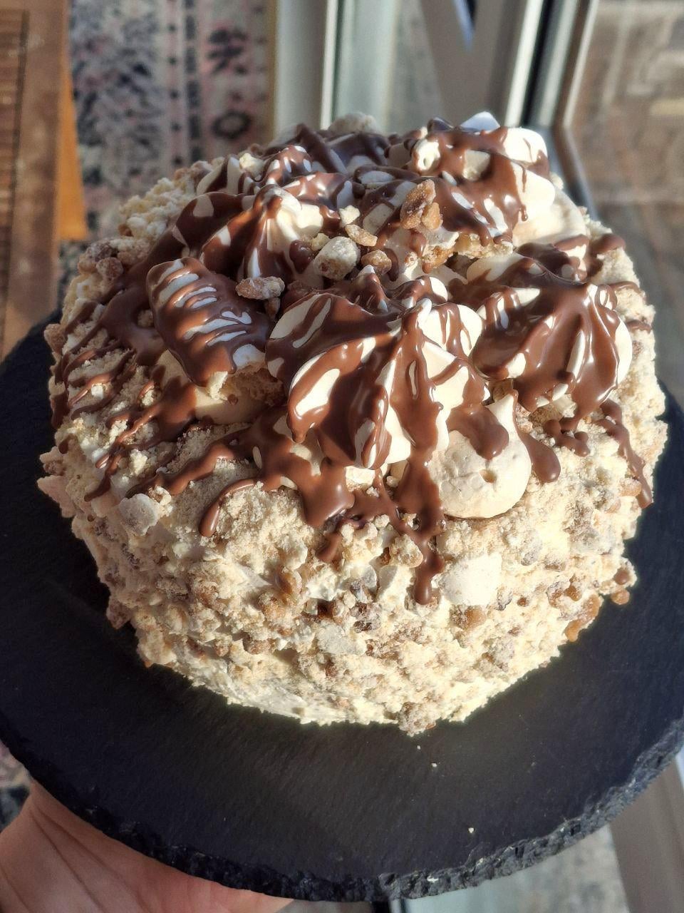 This is called “Flight cake”. Consists of crunchy peanut meringue layers, buttercream “Charlotte” with a hint of Irish cream. Covered with meringue crumbs and topped with even more meringue and melted milk chocolate.