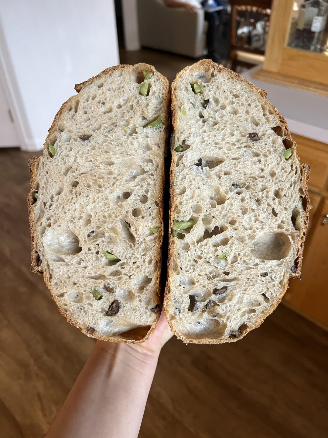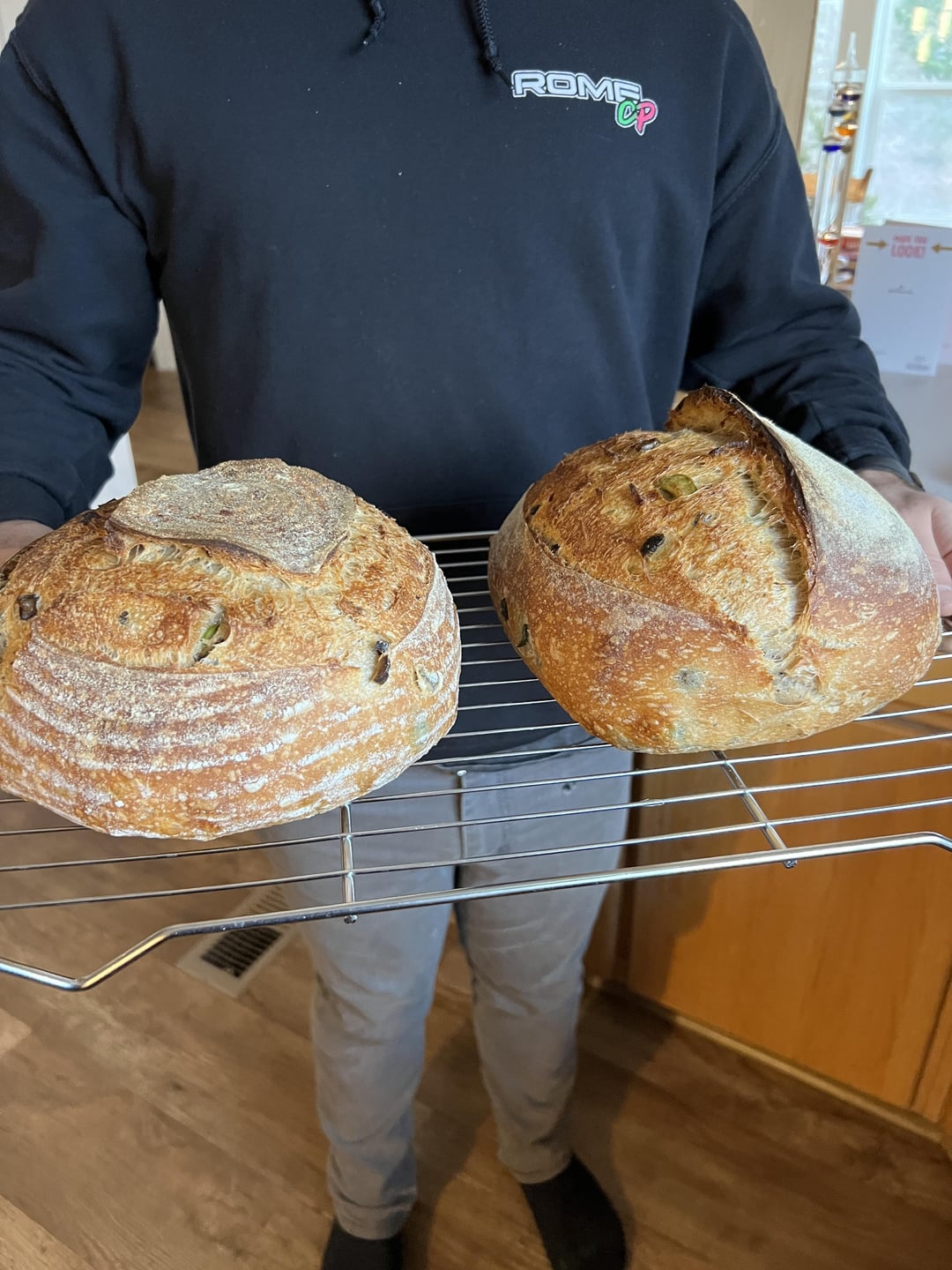 Mixed the leaven and water (700g) first. Then added the flour and mixed. Let rest for 40mins. Then added the 25g water, 25g evoo, and 20g salt and mixed. Let rest for 30mins. Added the olive, lemon, herb mixture. Folded and mixed until incorporated. Did 3 more coil folds with 30mins rests between. Finished the bulk ferment. Divided the dough into two loaves and pre-shaped. Bench rest for 20mins. Final shaped into boule and batard bannetons and into the fridge for cold ferment for roughly 12 hours. Preheated Dutch oven to 500F. Baked with the lid on at 450F for 20mins and lid off for 25mins for both.