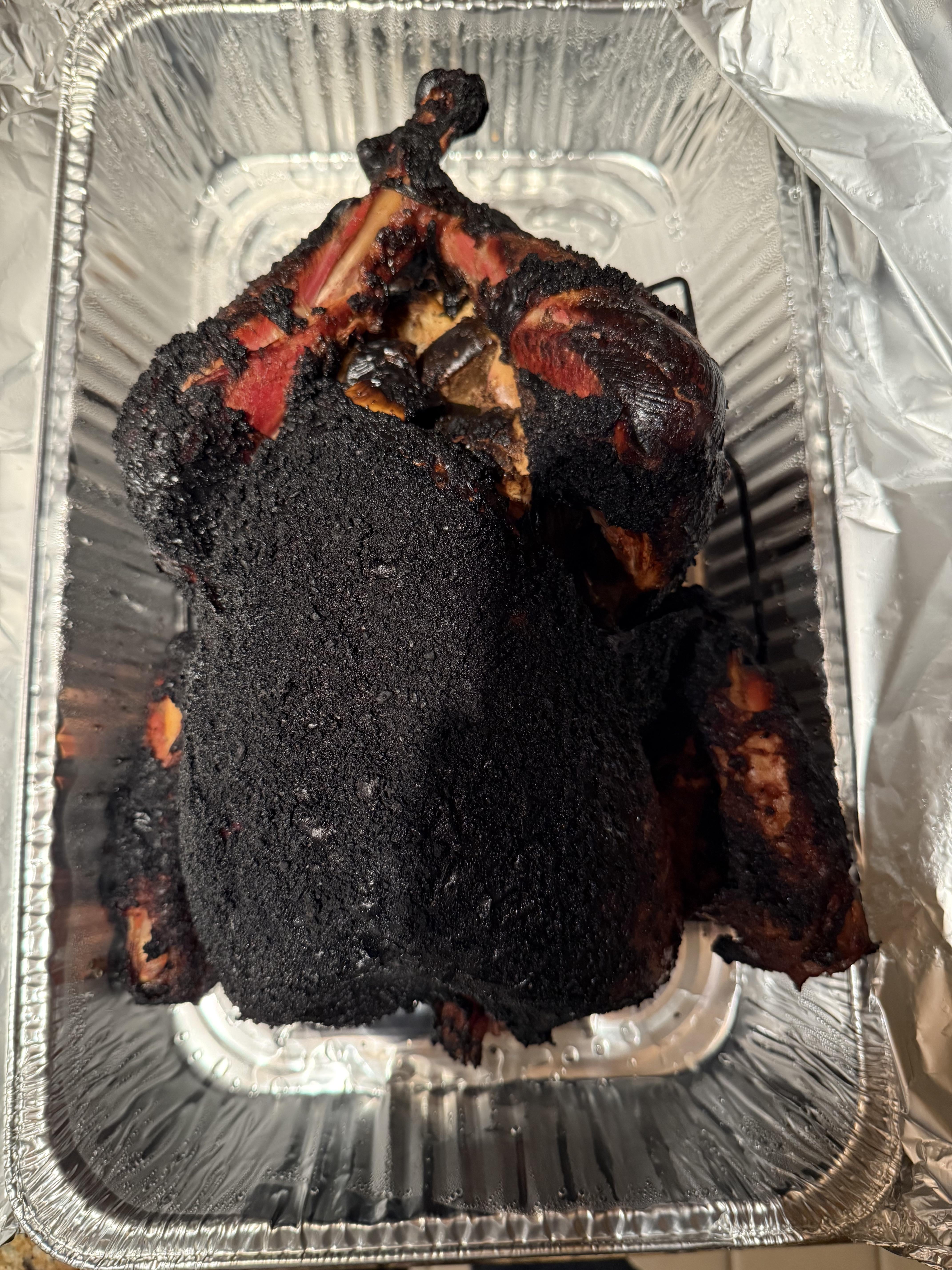 Just for the hell of it I carved it up. I peeled the skin to get rid of the char and then carved off the breasts. They were perfectly fine. The legs and wing had no hope so I’ll cube it up and make soup.