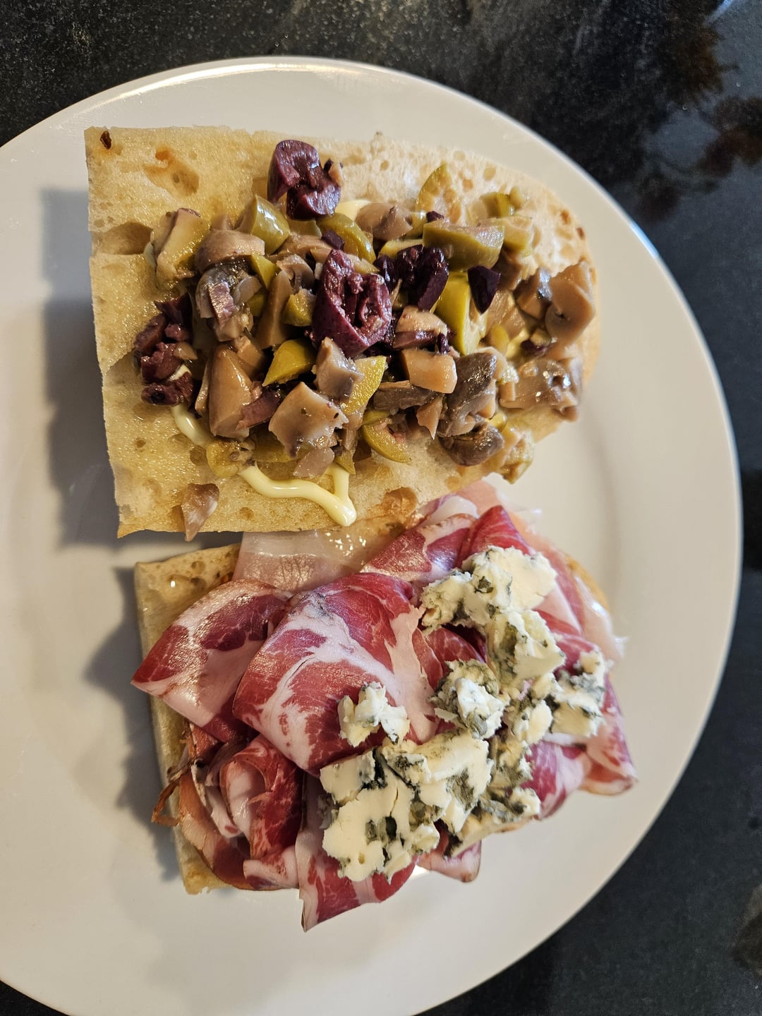 Had some unused stuff from a charcuterie board so decided to turn it into a sandwich. Roasted garlic bread, slathered in butter and warmed. Speck and coppa, Roquefort, mixed olives and marinated mushrooms. Kewpie and chili crisp.by chefpatrick 1 Comment bonushumans 11 months ago GeniusWrite A CommentYou must be logged in to post a comment.