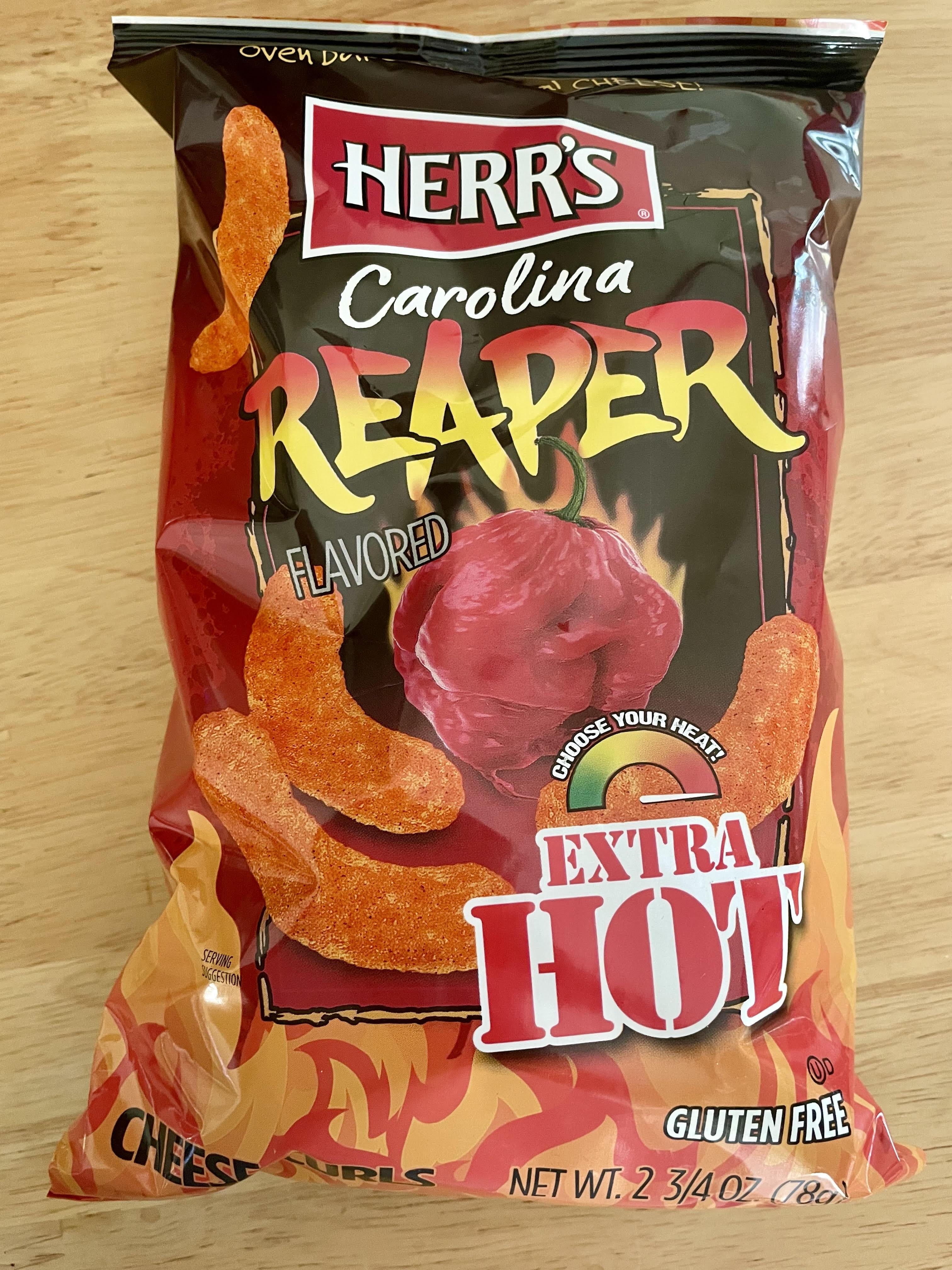 I’d recently seen some discussion/arguments here about Herr’s Reaper cheese puffs – some people were saying they were shockingly spicy, while others were saying they’re milder than Flamin’ Hot Cheetos.