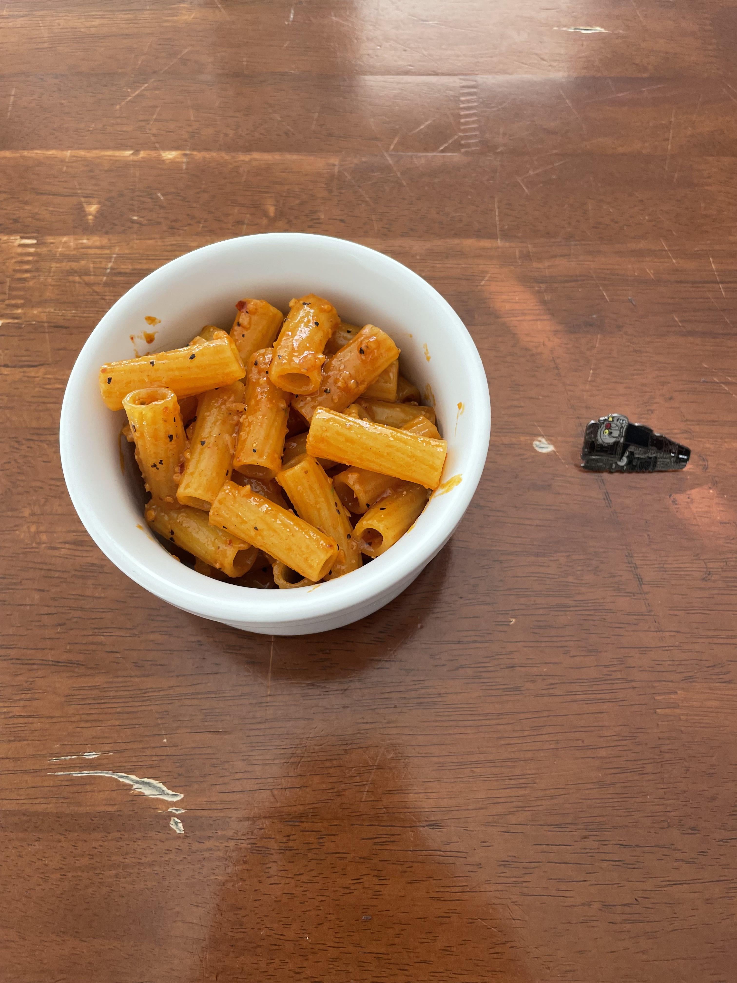 1 tablespoon of butter, 2 tablespoon of olive oil, 1 tablespoon of garlic, a teaspoon of black pepper, 1/4 tablespoon of red pepper flakes, 3 tablespoon of Gochujang, 1 tablespoon of honey, 1 tablespoon of fish sauce, and some of the starchy pasta water.