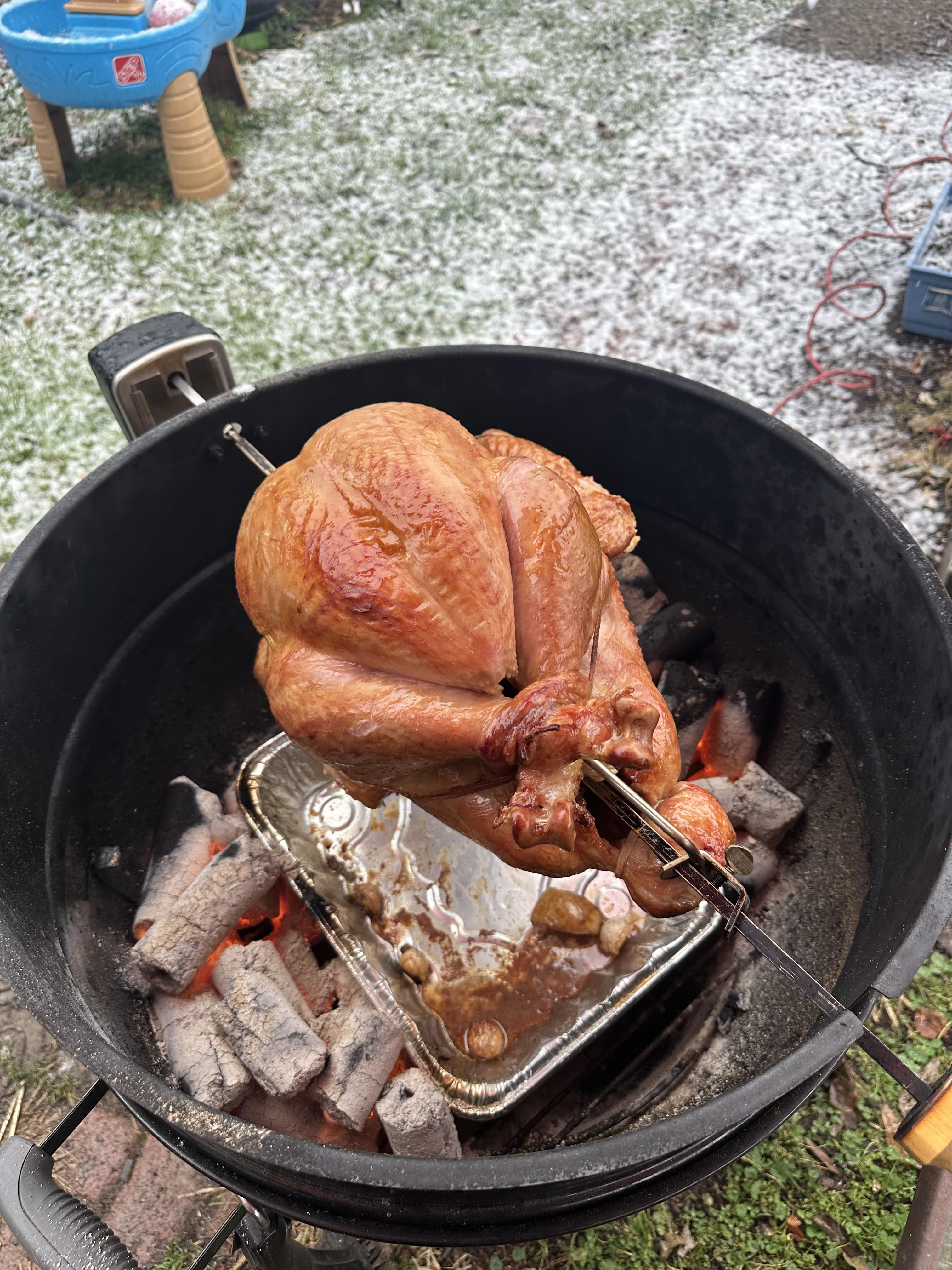 I bought a rotisserie last year. I attempted one whole chicken on it. Not sure what I did wrong, but it was way too loose on the rotisserie. It would go half way, then just plop down when gravity set in, then start making the next turn and do the same thing. It spun all the way around for as long as I needed it to, but just kept plopping every half turn. I think a turkey would do me in…