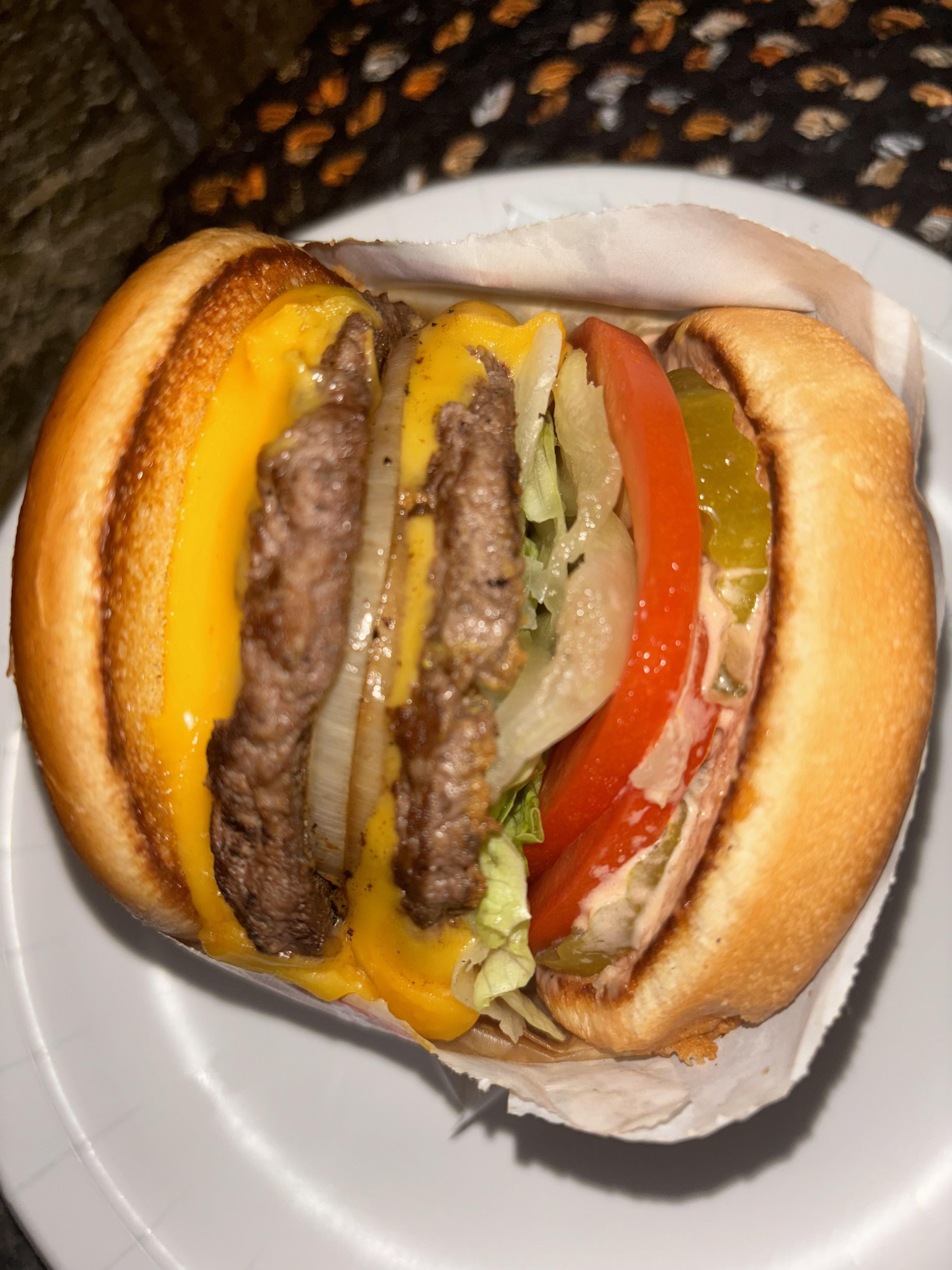 In n out double double mustard fried with lettuce, tomato, spread, pickles, and unchopped grilled onions 😍 I normally go just cheese and spread sauce but their ingredients are pretty fresh for fast food so I loaded it up and heavily enjoyed